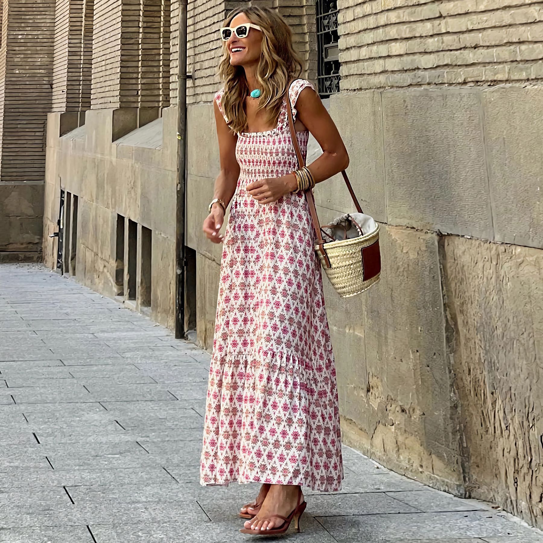 Summer Women's Elegant Print Elastic Strap Skirt Holiday Style French Fragmented Flower Hanging Strap Long Dress