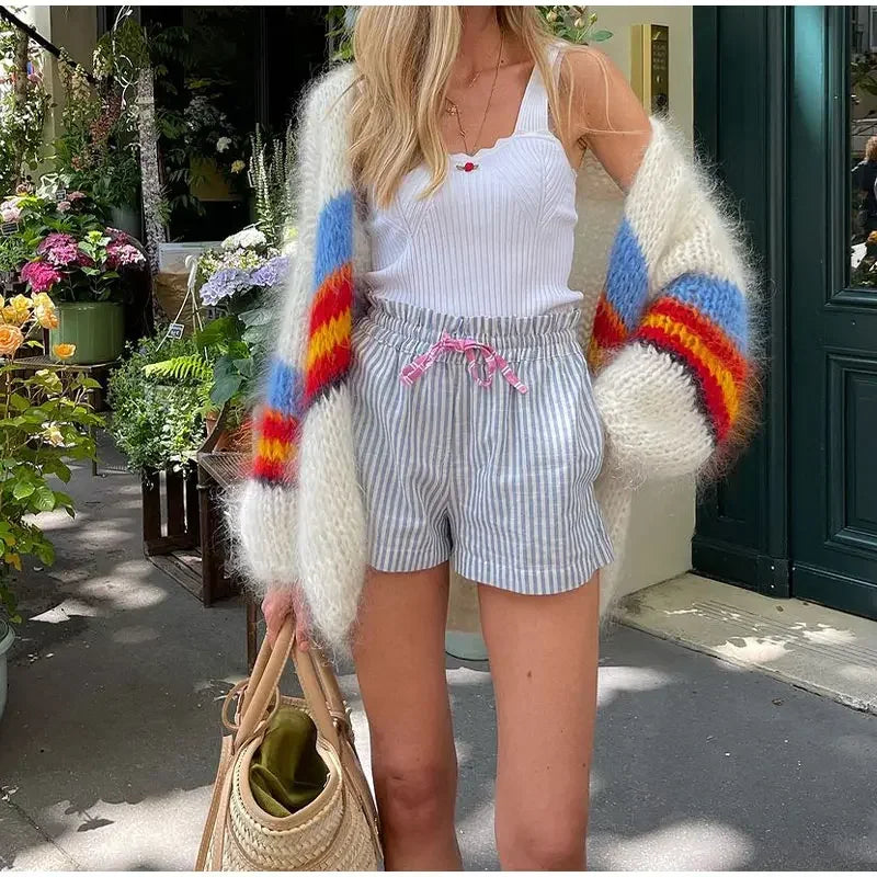 2024 New Autumn Women Mohair Stripe Cardigan Fashion Contrast Open Stitch Long Sleeve Sweater High Street Female Street Knitwear