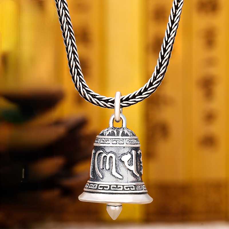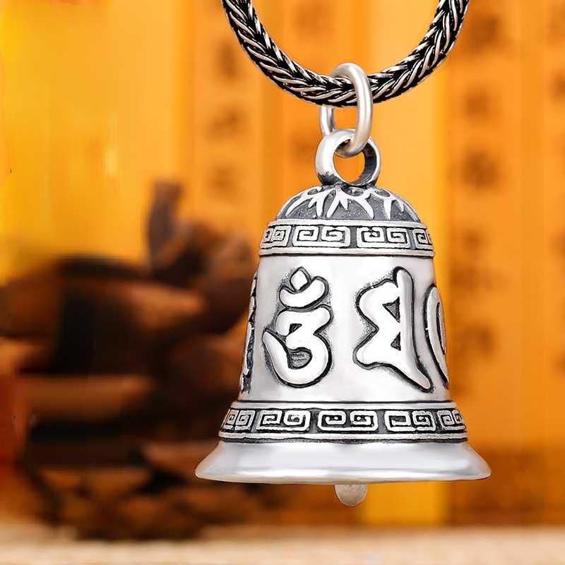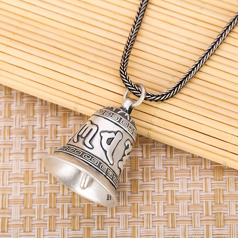 Silver Six-character Mantra Bell Pendant Vintage Men's Women's Ethnic Style Necklace