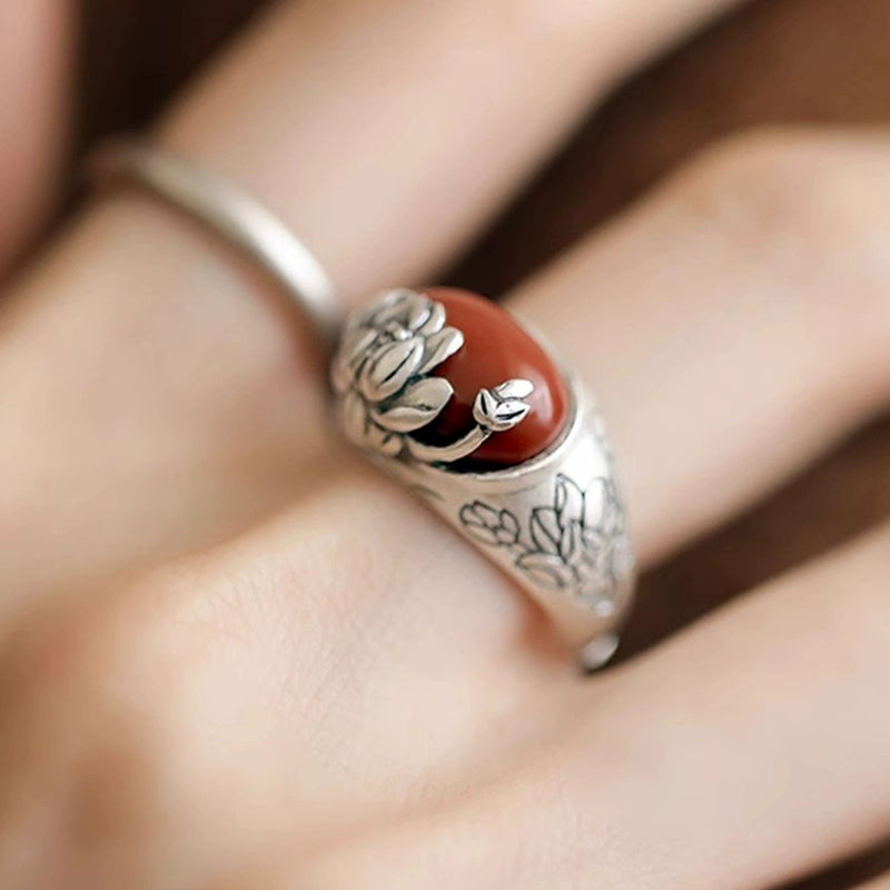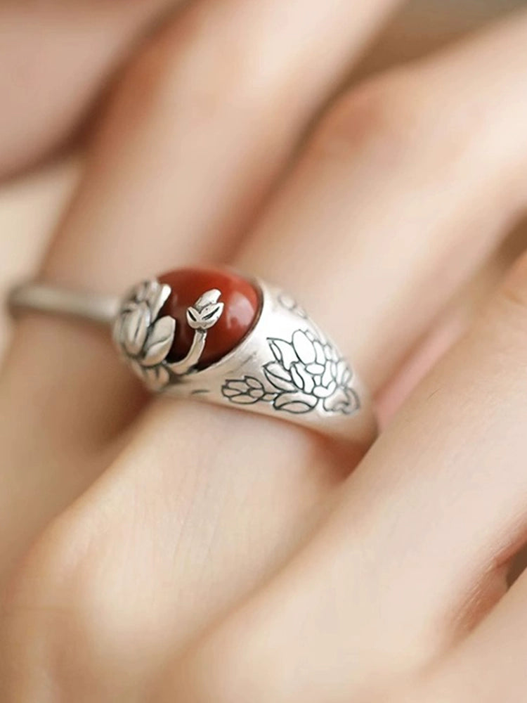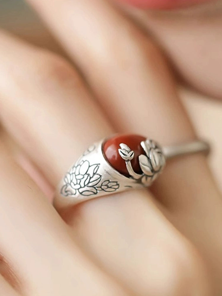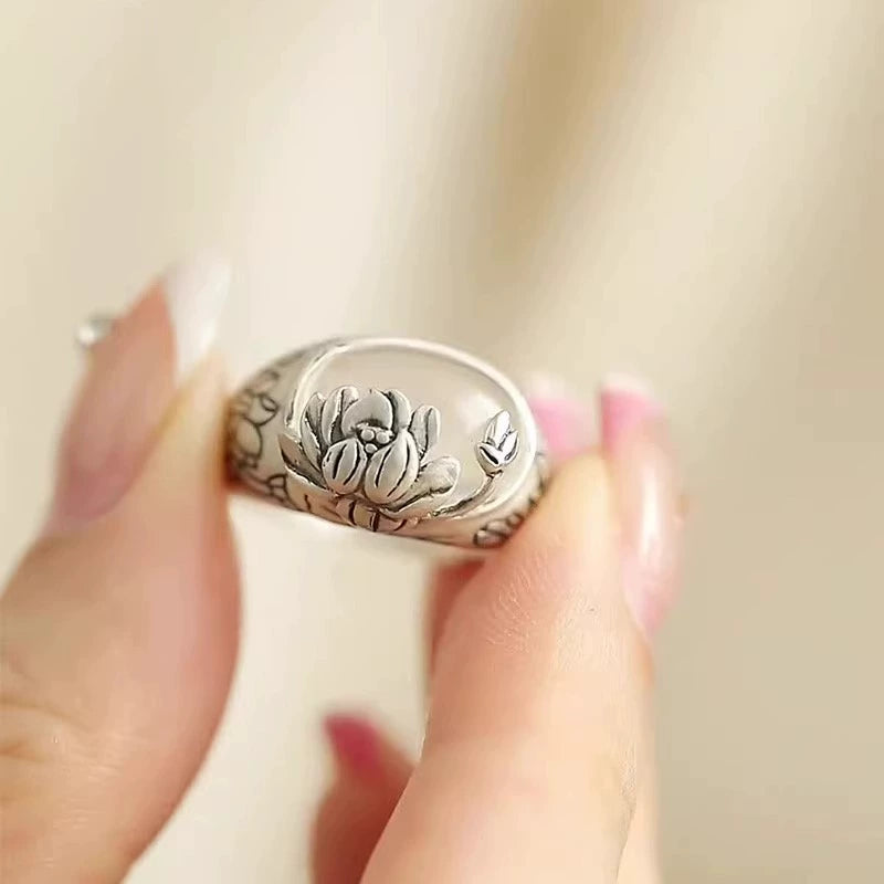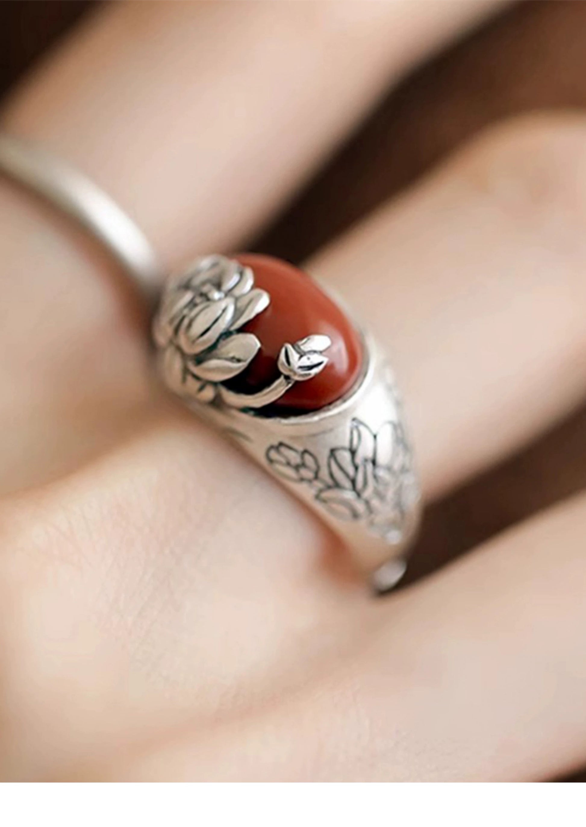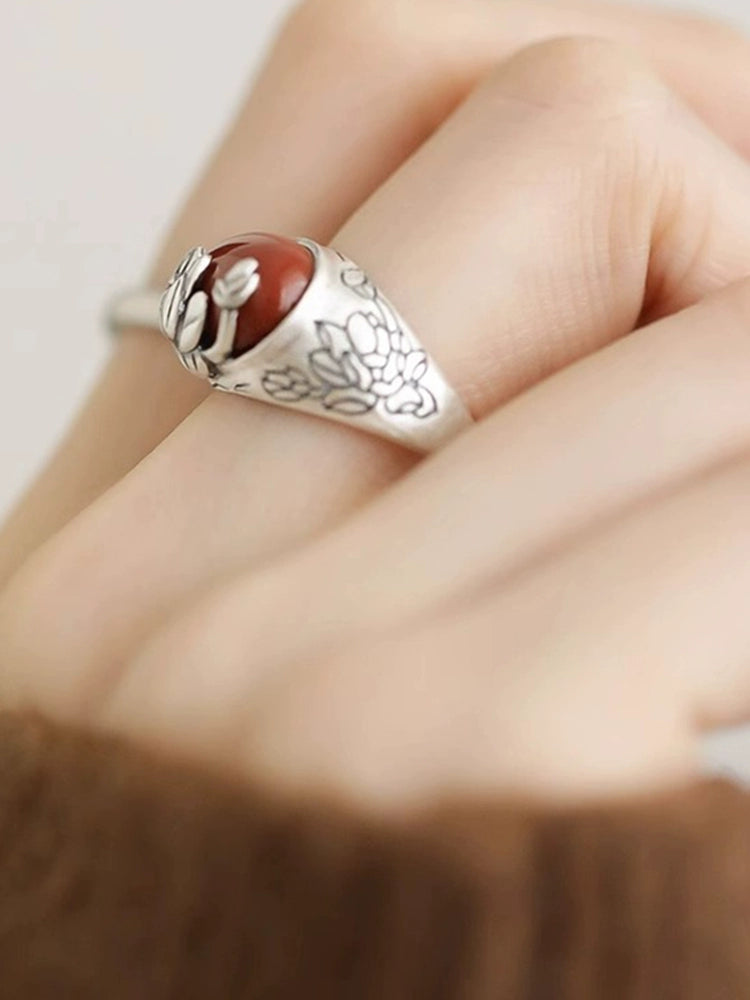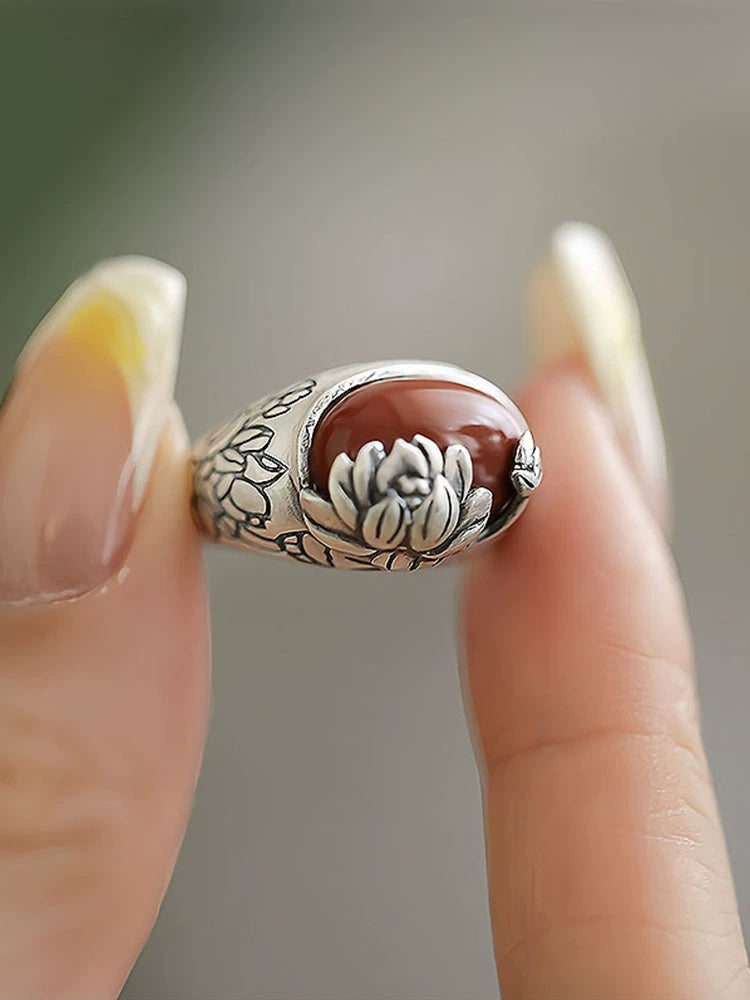 Agate Lotus S925 Silver Ring Women's 2024 New Niche Design Retro Style Index Finger Ring Mother's Day Gift