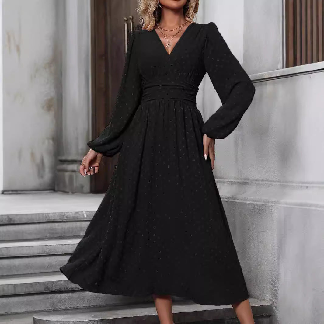 Autumn and Winter New Medium Hairball Diagonal Neck Lantern Sleeve Pleated Waist Dress