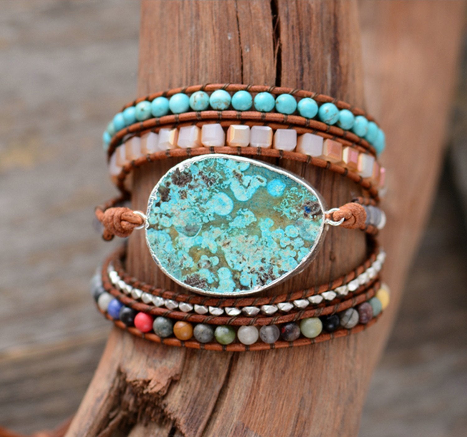 Bohemian Handmade Natural Stones Leather Wrap 5 Layer Bracelet