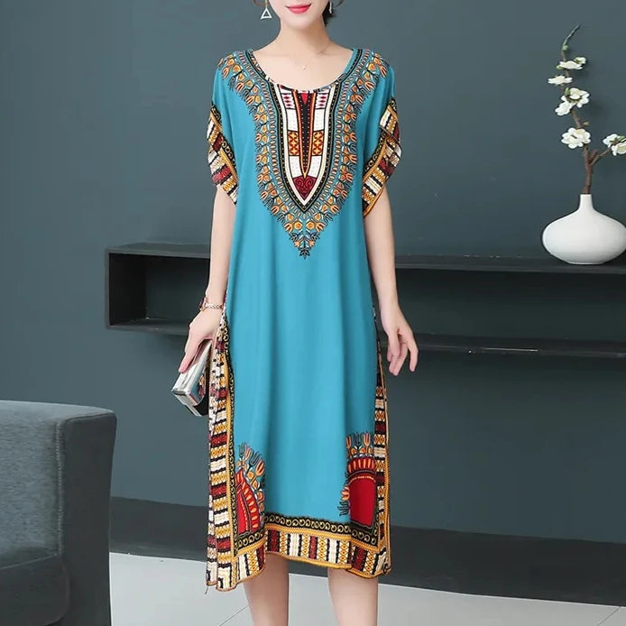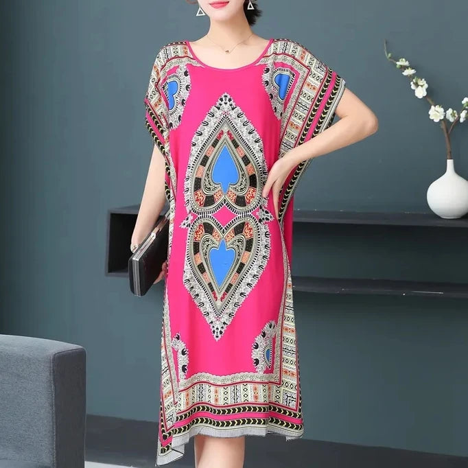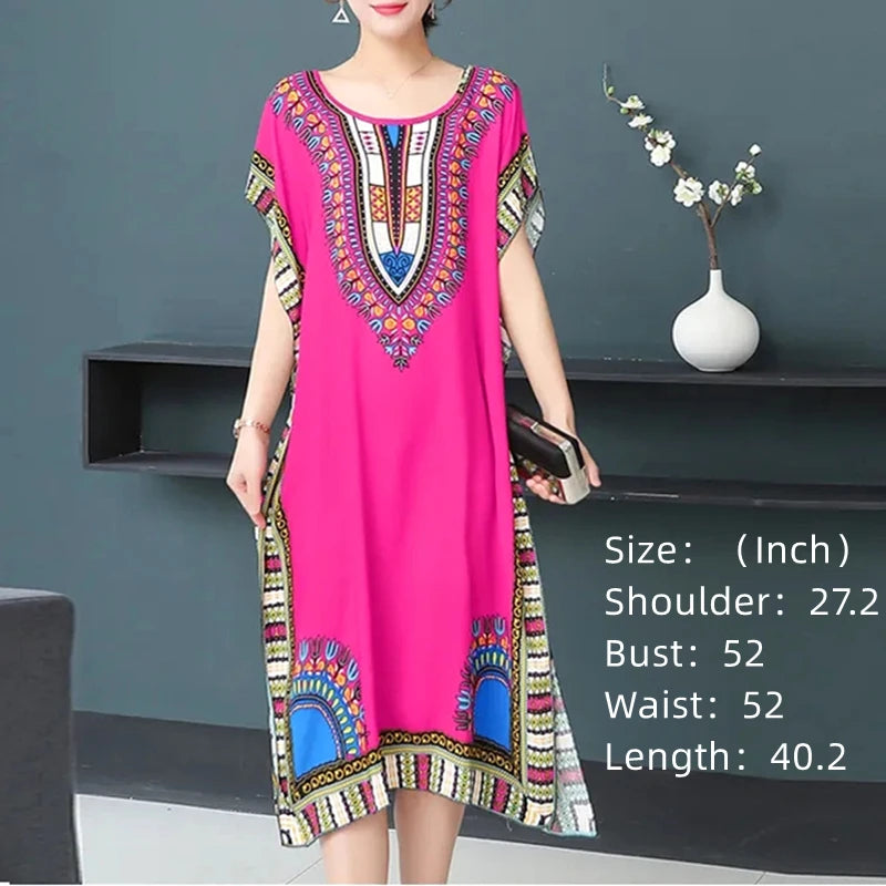 Bohemian National Style Leisure Holiday Beach Printed Poker Indonesia Floral O-neck Loose Midi Dress Pajamas Loungewear Woman