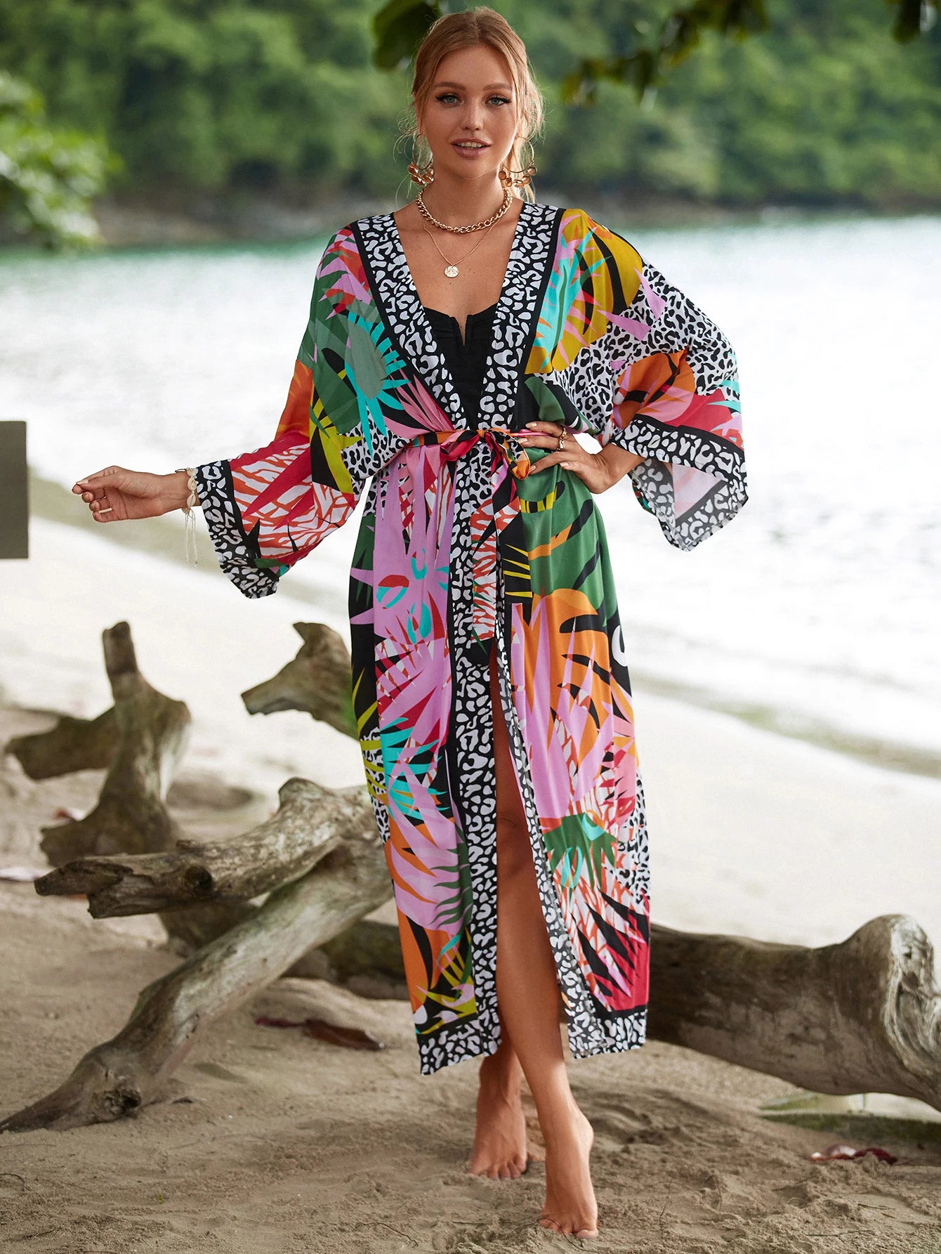 Bohemian Printed Belt Kimono Plus Size Batwing Sleeve Dress Summer Autumn Women Loose Beachwear Swimsuit Cover Up Sarong