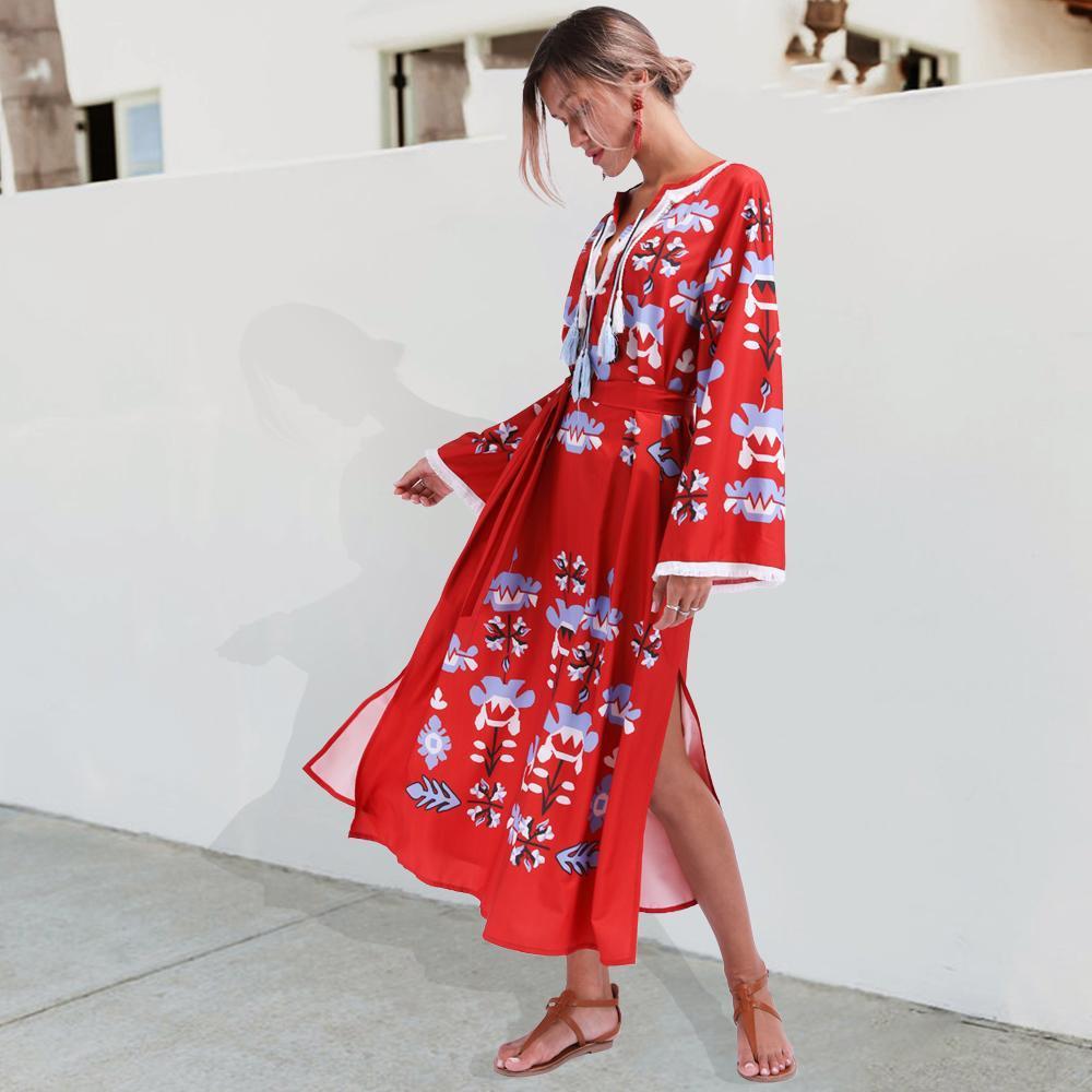 Bohemian Retro Sexy Print V-Neck Long-Sleeved Beach Long Dress