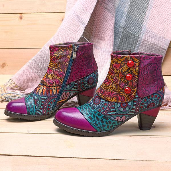 Boho Splicing Pattern Button Zipper Ankle Leather Boots