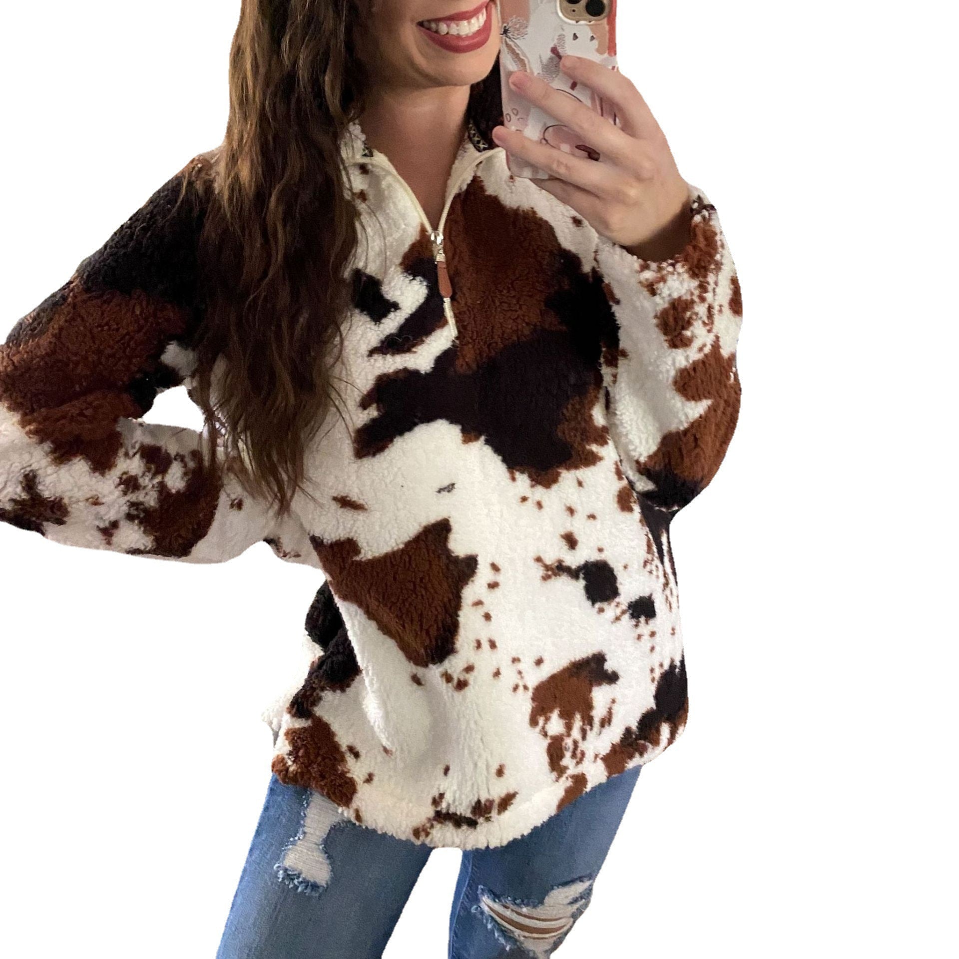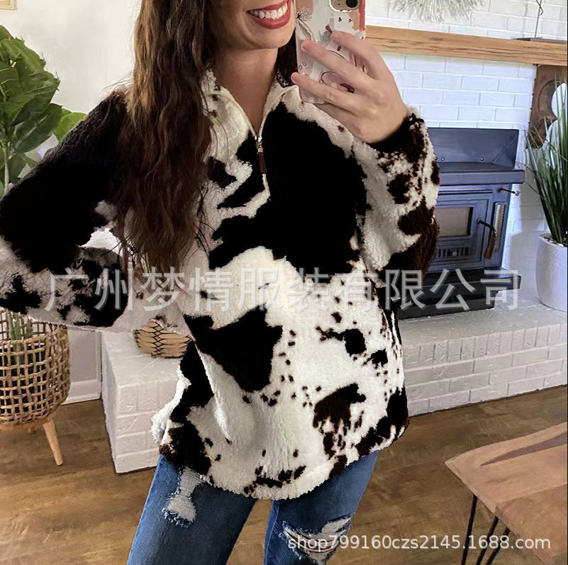New Autumn and Winter Leisure Fashion Plush Coat Female Cow Printed Zipper Sweater
