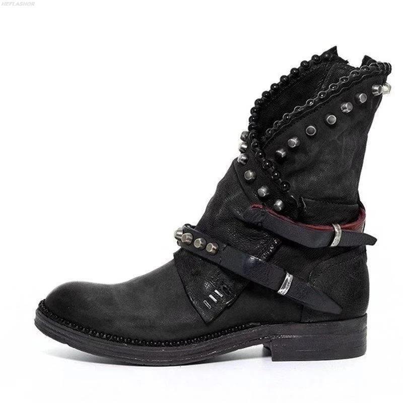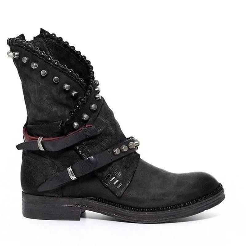 Autumn Winter Woman Mid-Calf PU Leather Round Toe Shoes Low Heel Rivet Cool Motorcycle Boots