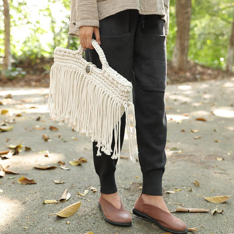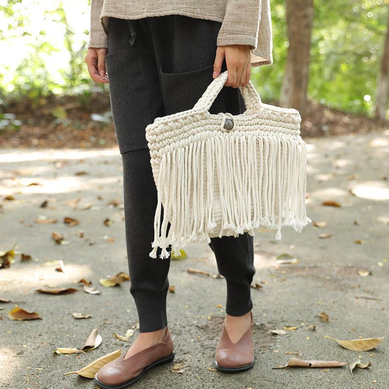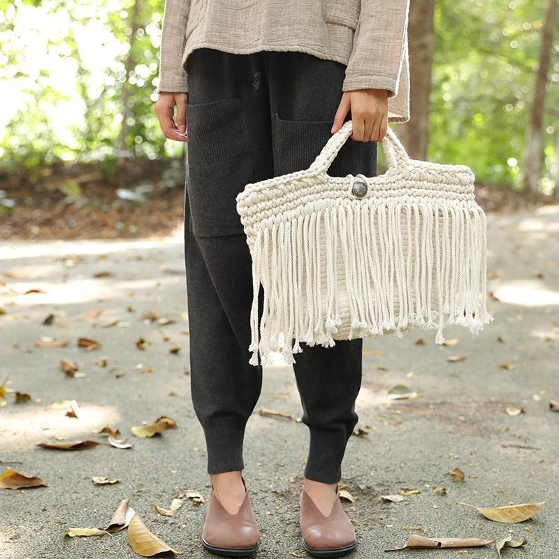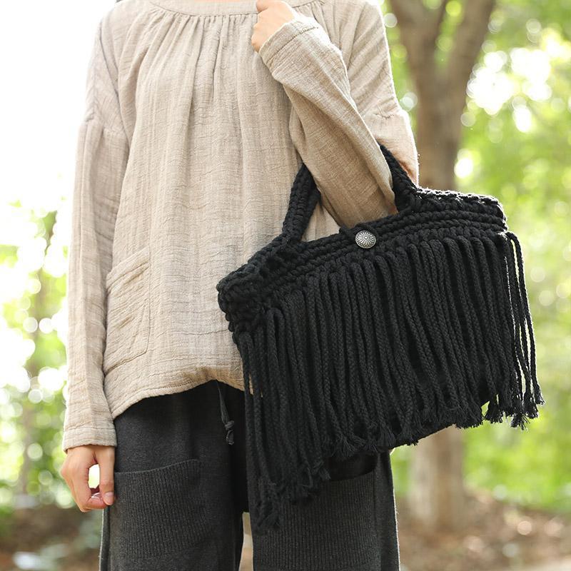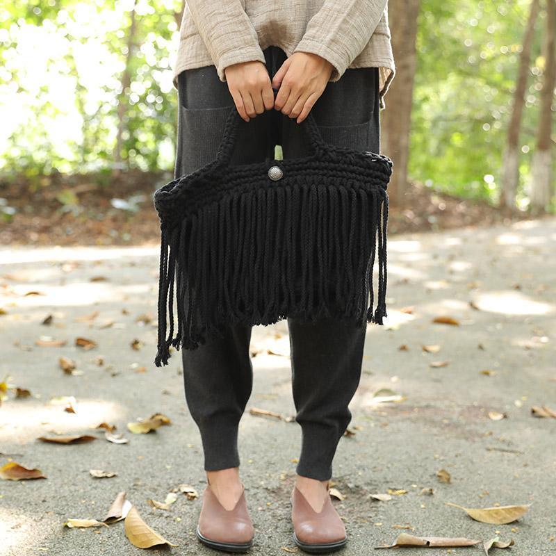 Delicate Cotton Linen Knitted Black And White Two Colors Tassel Handbag