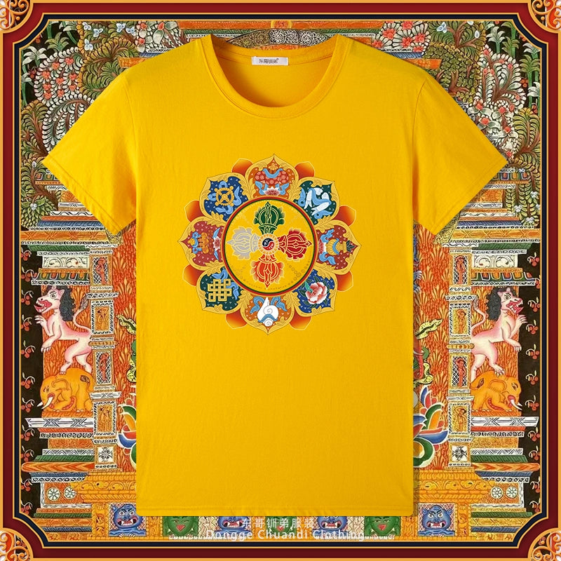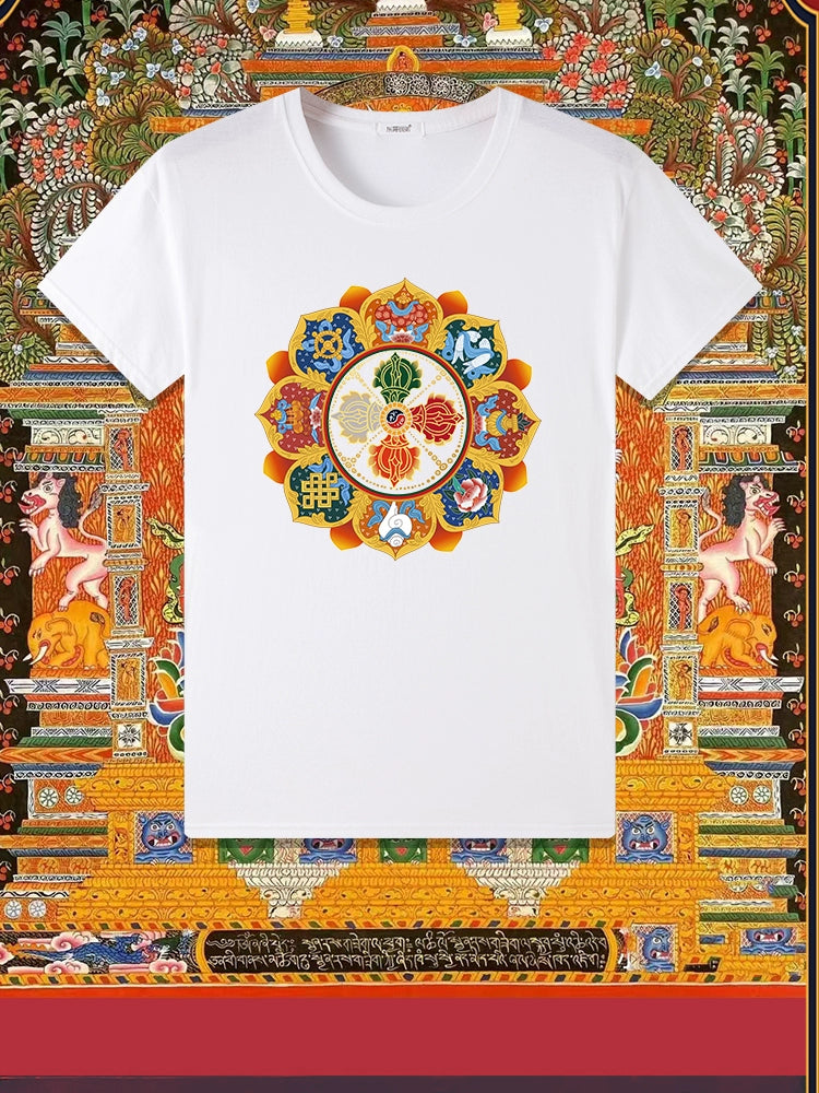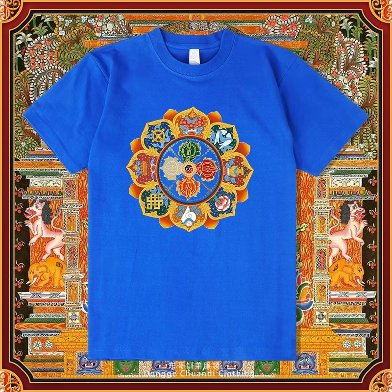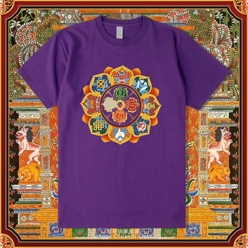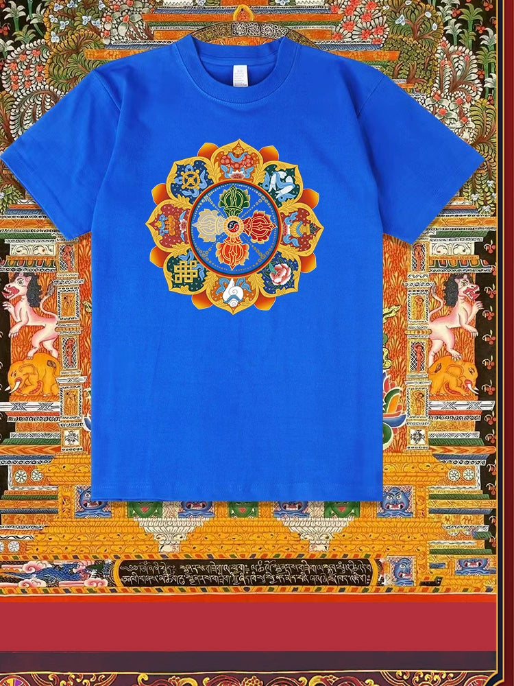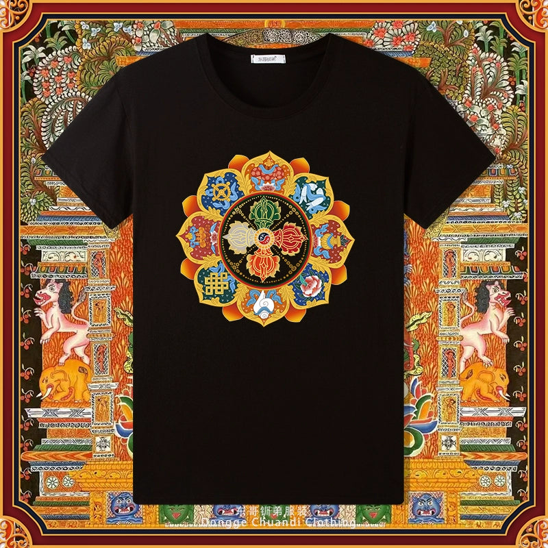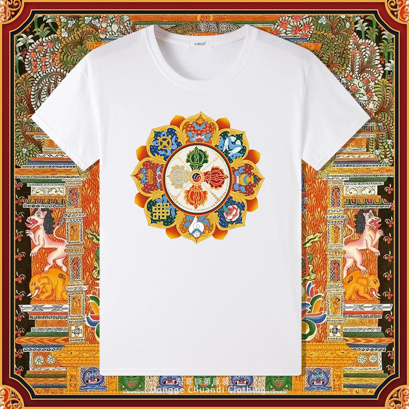 Diamond Pestle Babao New Printed Pure Cotton Mantra Wheel T-shirt Top, Buddhist Men's and Women's High-end Clothing