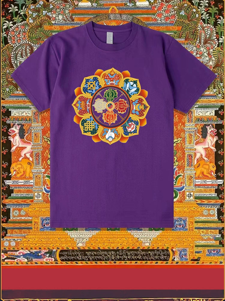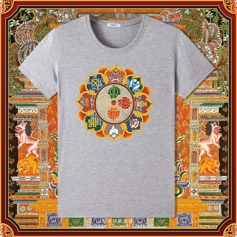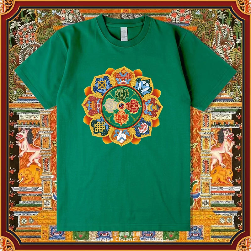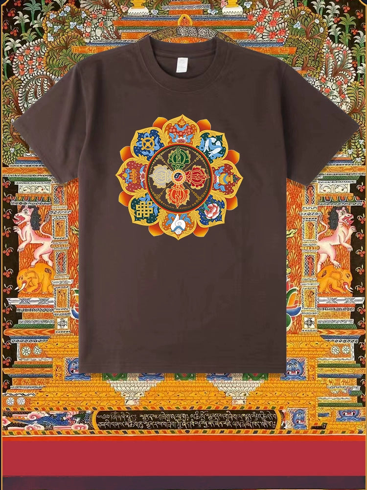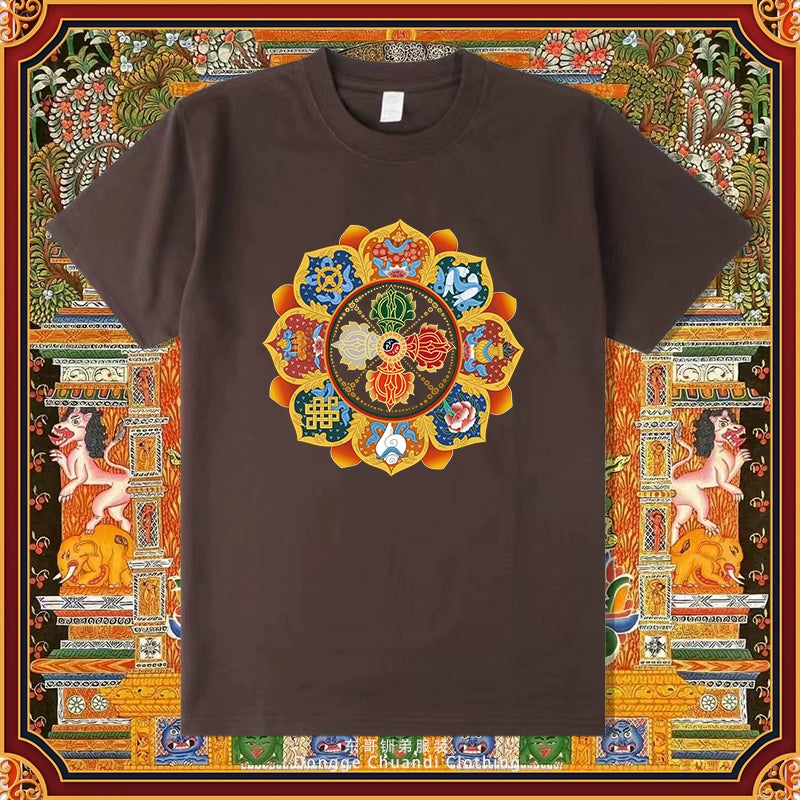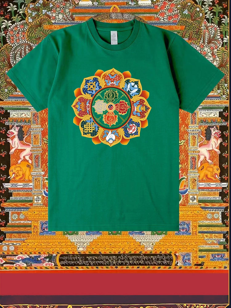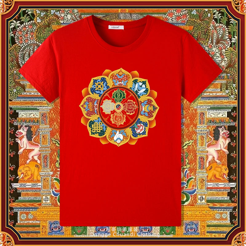 Diamond Pestle Babao New Printed Pure Cotton Mantra Wheel T-shirt Top, Buddhist Men's and Women's High-end Clothing