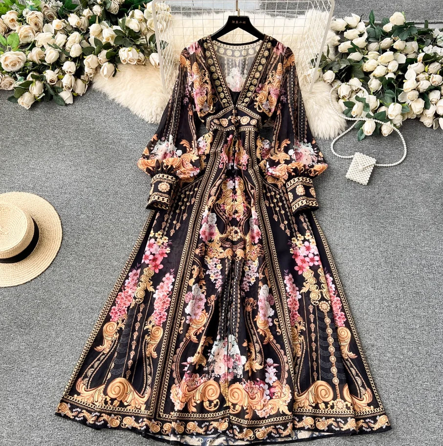 Elegant Lantern Sleeve Single-breasted Dress Bohemian Slim Waist Belt Fashion Dresses Women Vintage A-line Print Party Vestidos