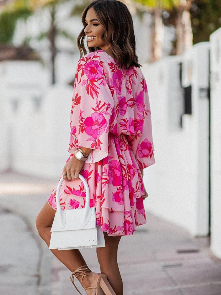 Elegant Office Dress For Wome's Casual Bat Sleeve Flowers Print Bohemian Beach Vacation Sundress Women Summer Ruffl Mini Dresses