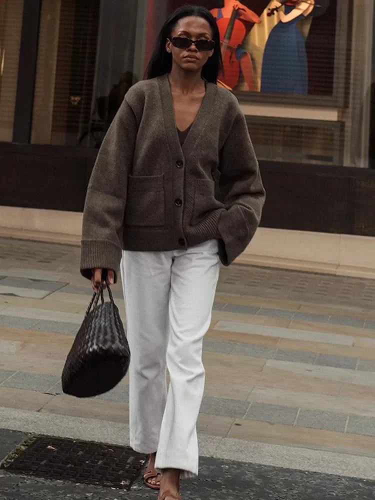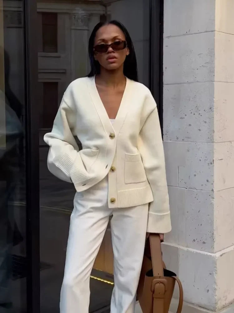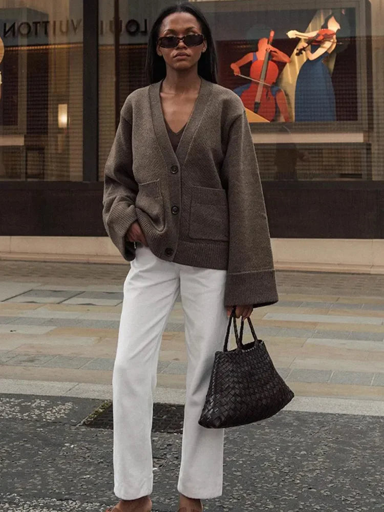 Elegant Solid V Neck Pocket Knitted Cardigan Women Casual Long Sleeves Single-breasted Loose Sweater 2024 Autumn Lady Streetwear