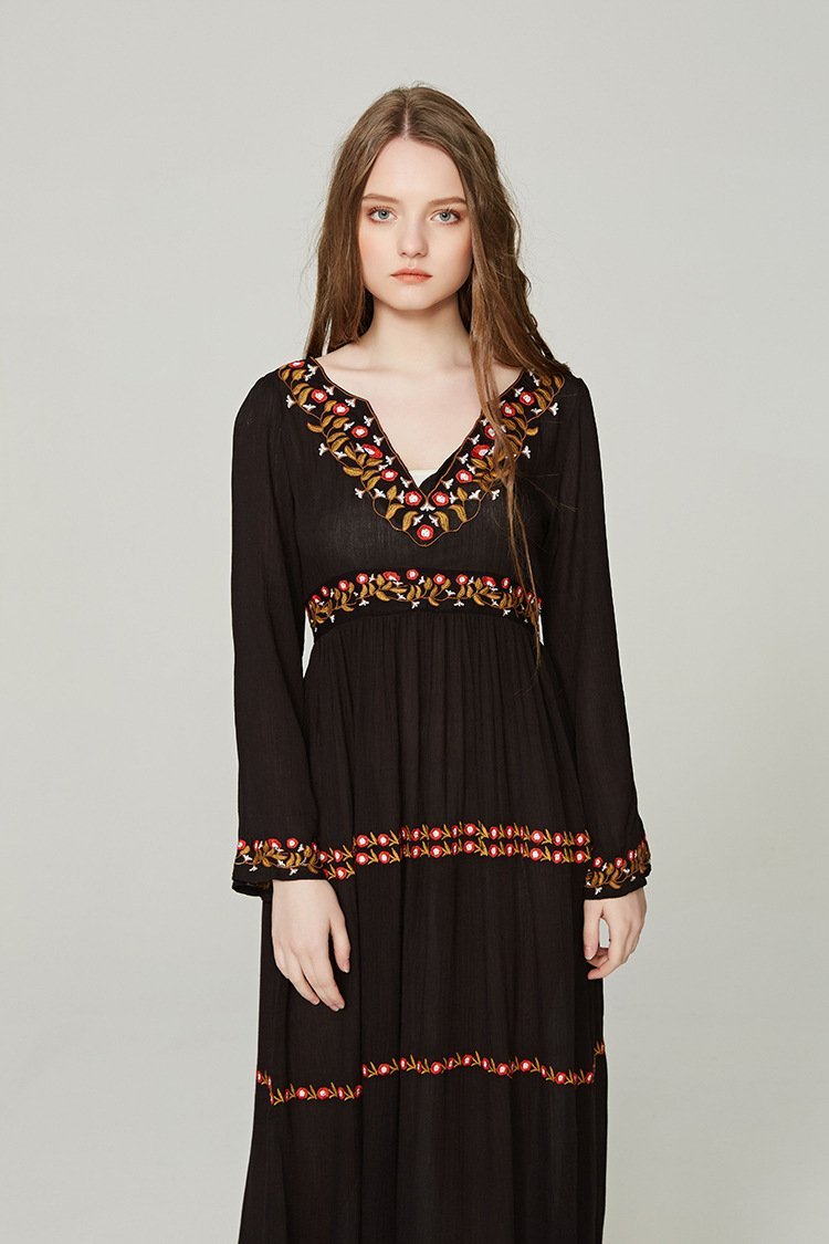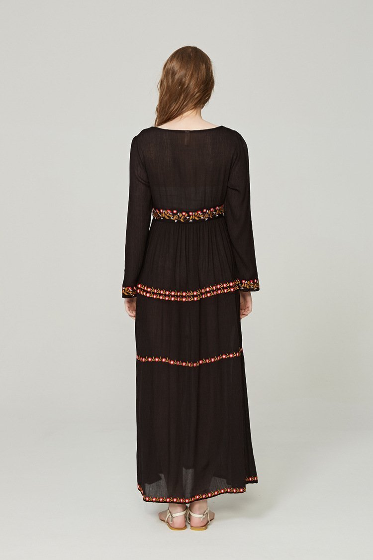 Feature : V Neck Long Sleeve Embroidered Maxi Dress