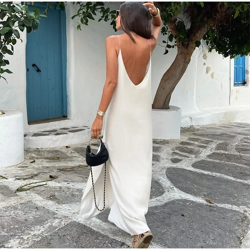 Elegant White V-neck Slit Maxi Dress For Women Fashion Backless Sleeveless Sling Dresses 2024 Summer Female Beach Vacation Robes