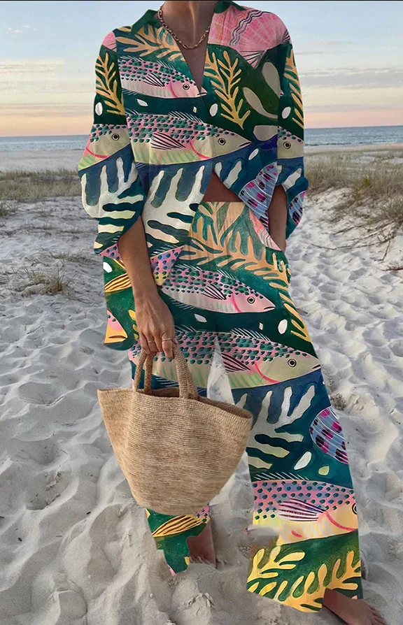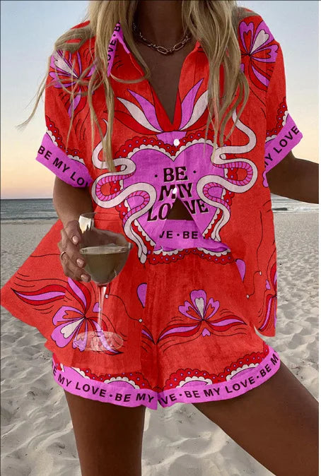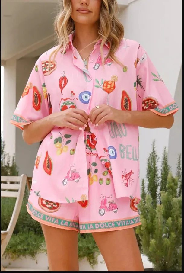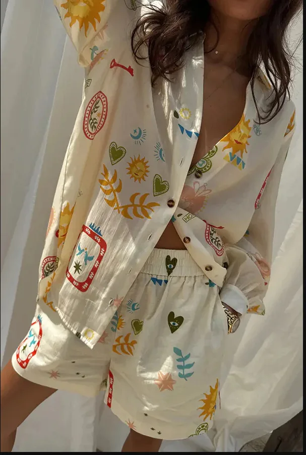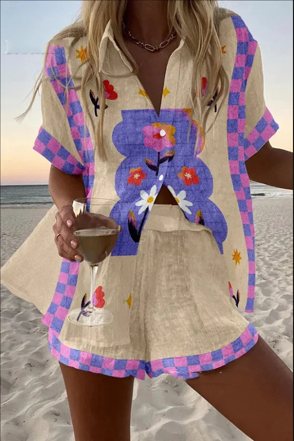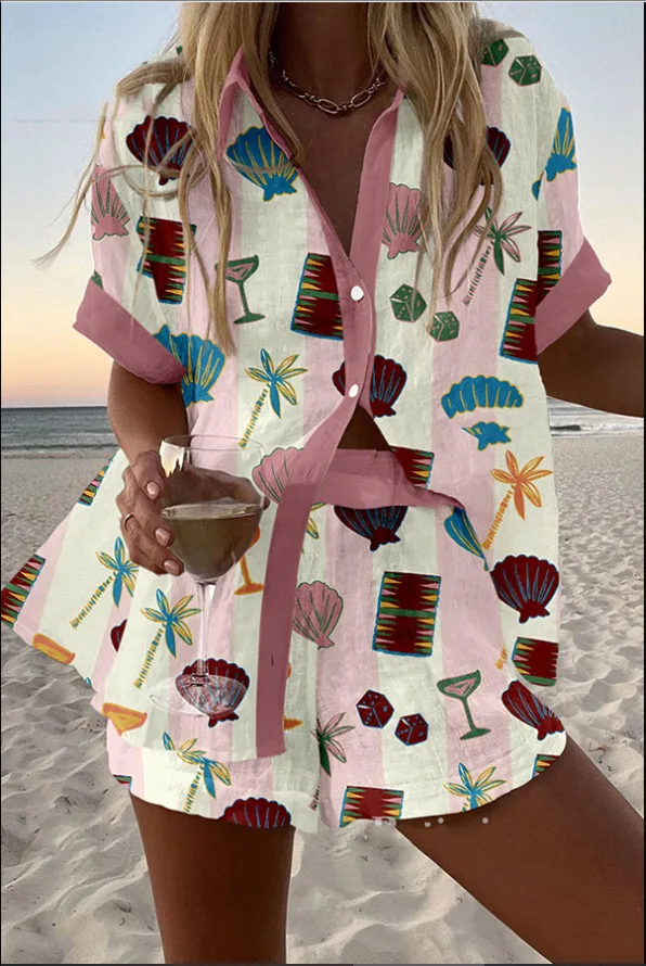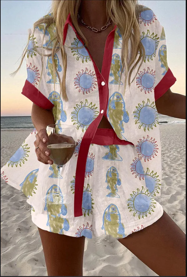 Fashion Print Beach Holiday 2-Piece Set Women Summer Short Sleeve Shirt Top + Wide Legs Short Women's Oversized Two-Piece Outfit