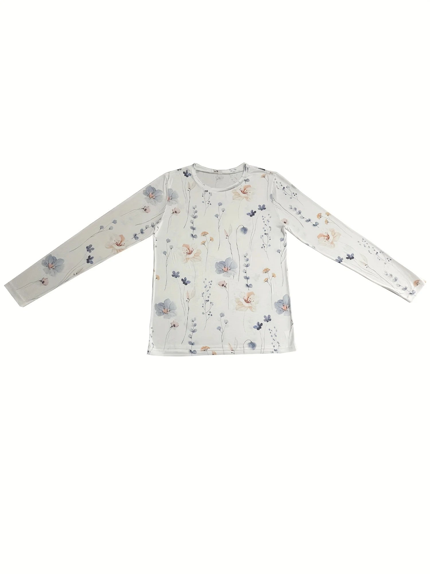 Floral Print Crew Neck T-Shirt, Casual Long Sleeve Top For Spring & Fall, Women's Clothing