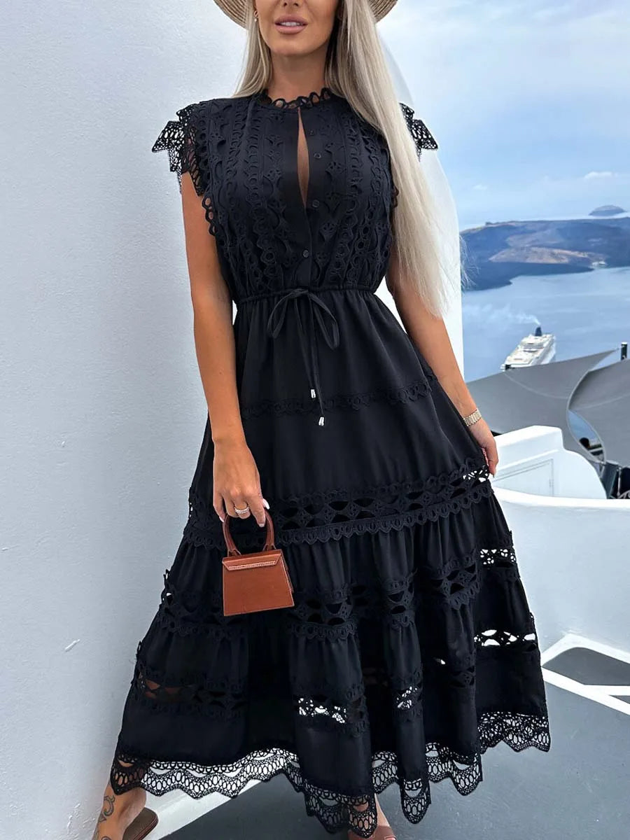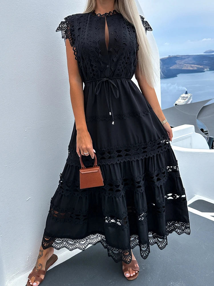 Hollow Out White Dress Women Summer Short Sleeve Lace Up Dress Ladies Elegant Fashion Lace Splicing Boho Holiday Long Dresses