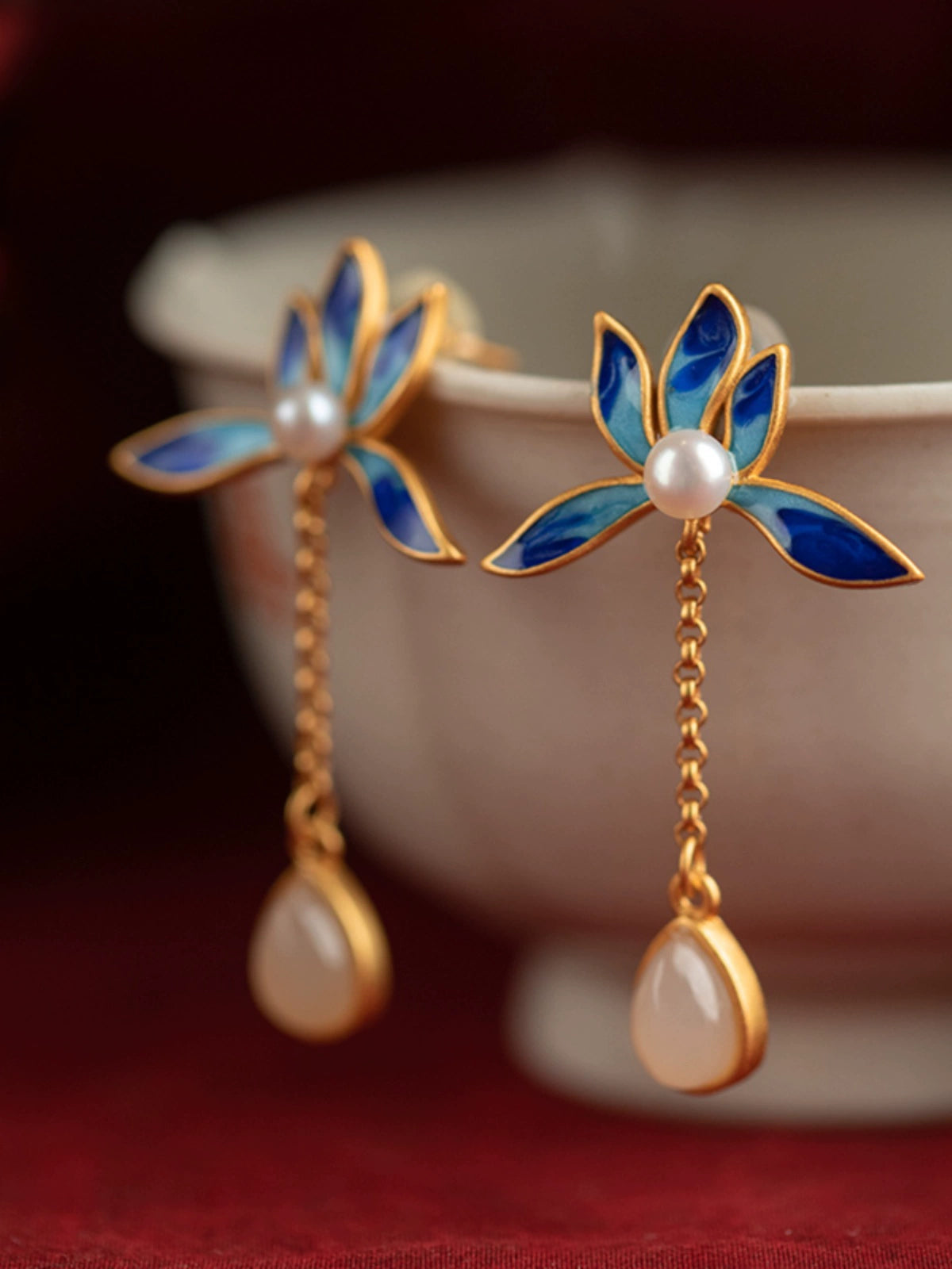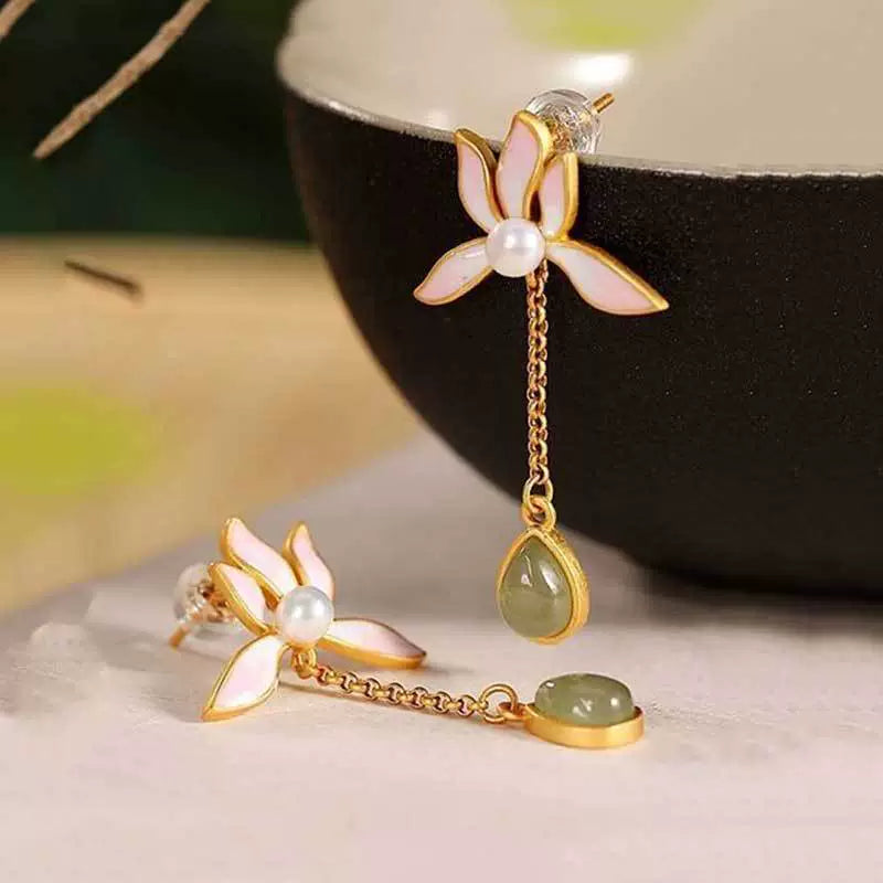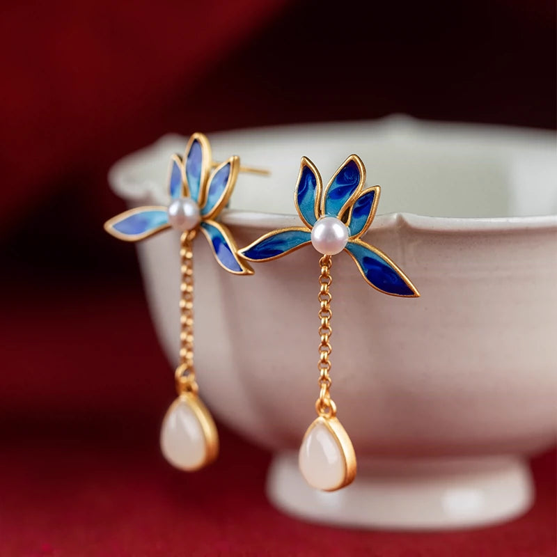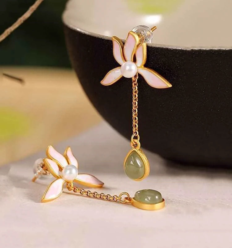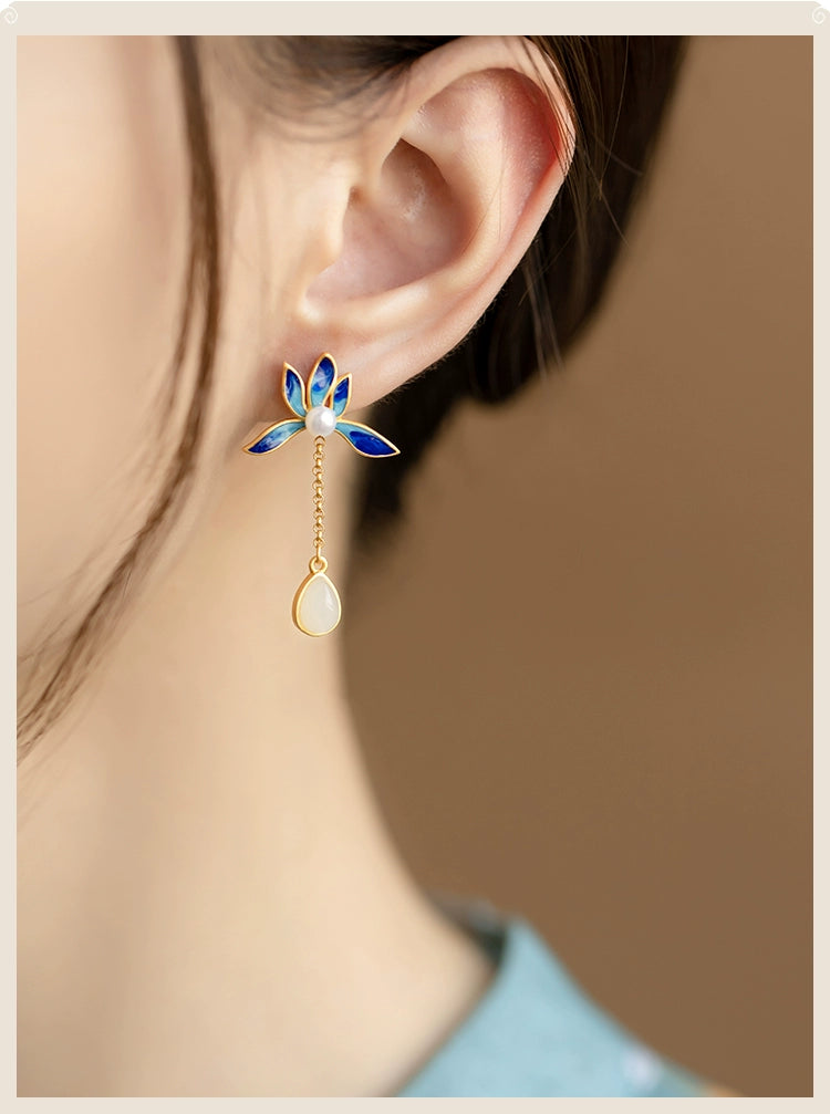 Natural Jade Tassel Long Earrings Female S925 Sterling Silver Lotus Ancient Temperament Palace Style Earrings Stud Ornaments