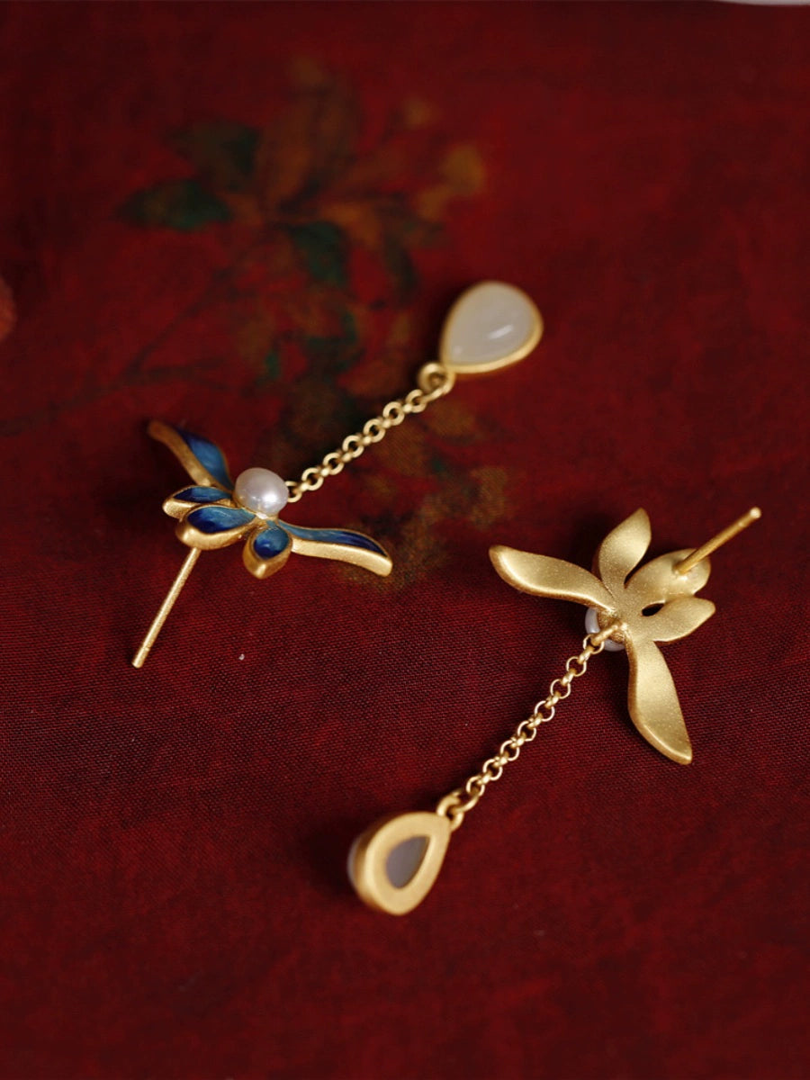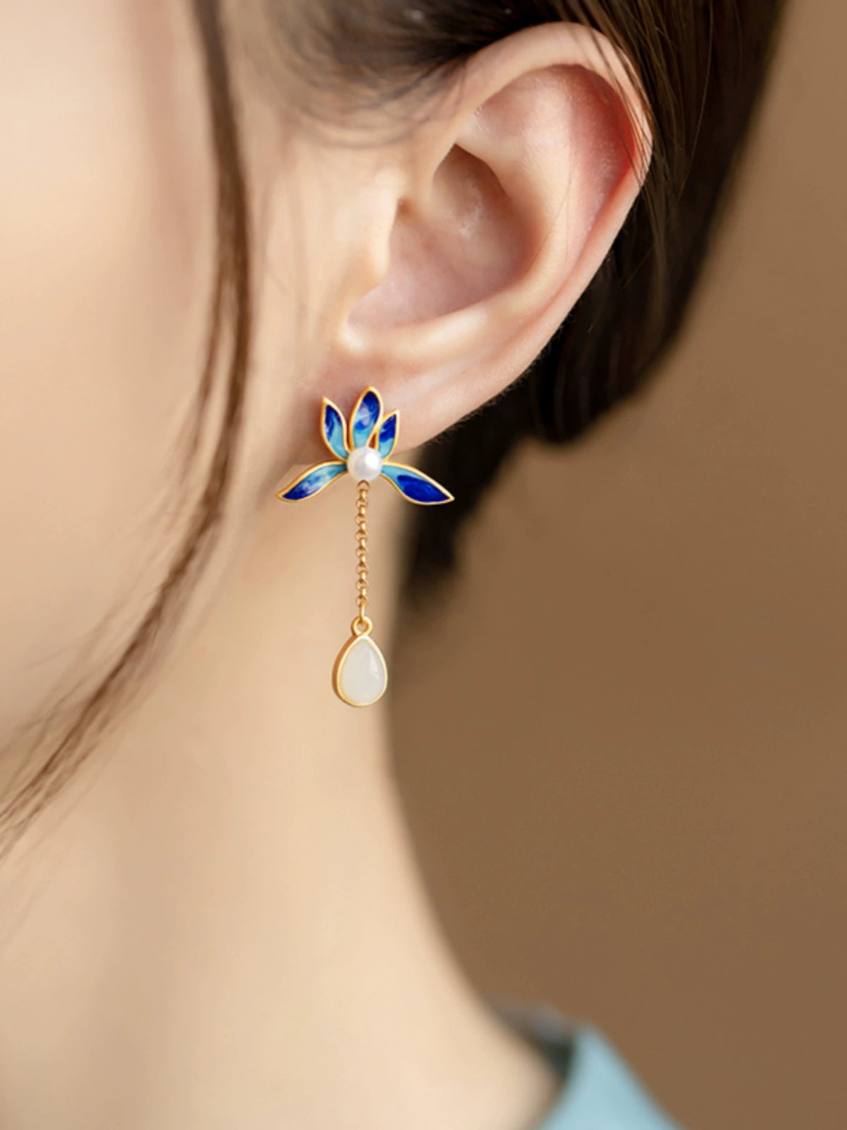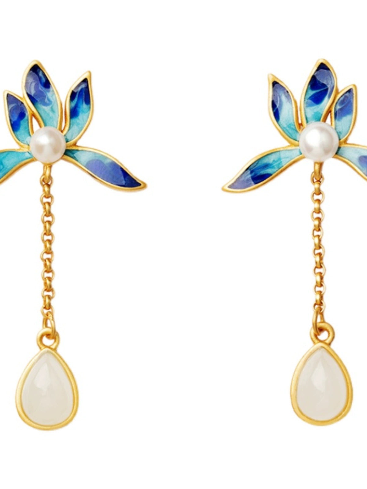 Natural Jade Tassel Long Earrings Female S925 Sterling Silver Lotus Ancient Temperament Palace Style Earrings Stud Ornaments
