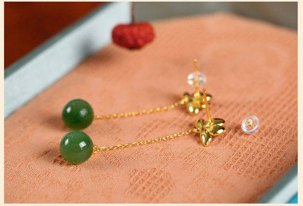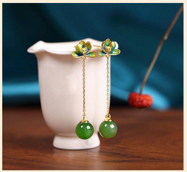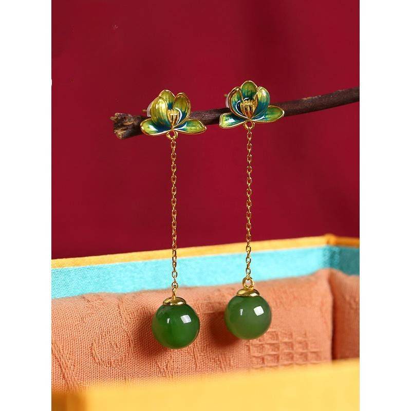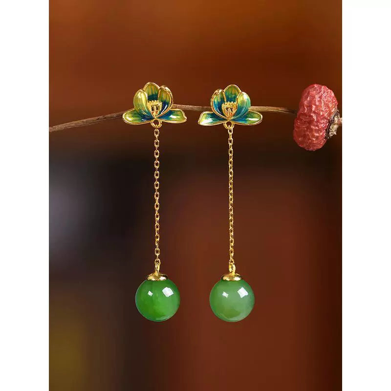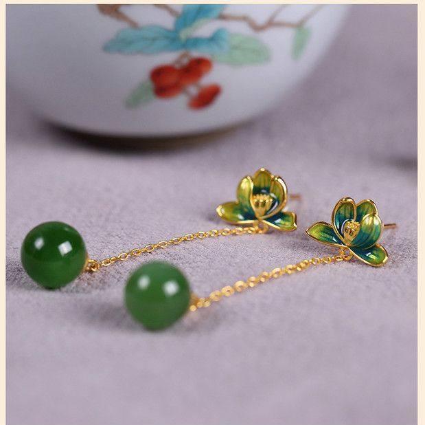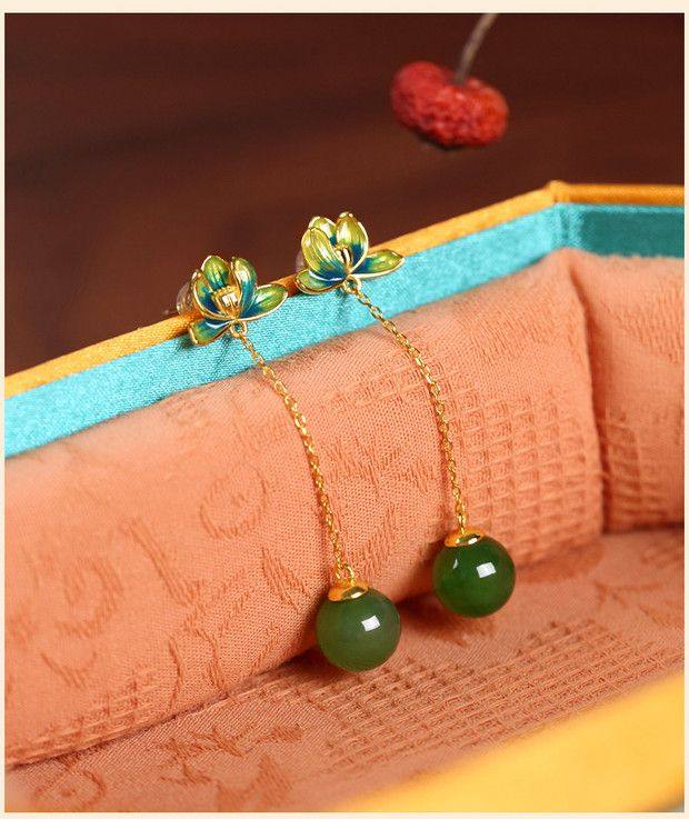 Jasper Lotus Heart Tibetan Style Enamel Color Lotus 925 Silver Jade Earrings Women's Fringed EarringsMaterial: Jade, Silver, Alloy