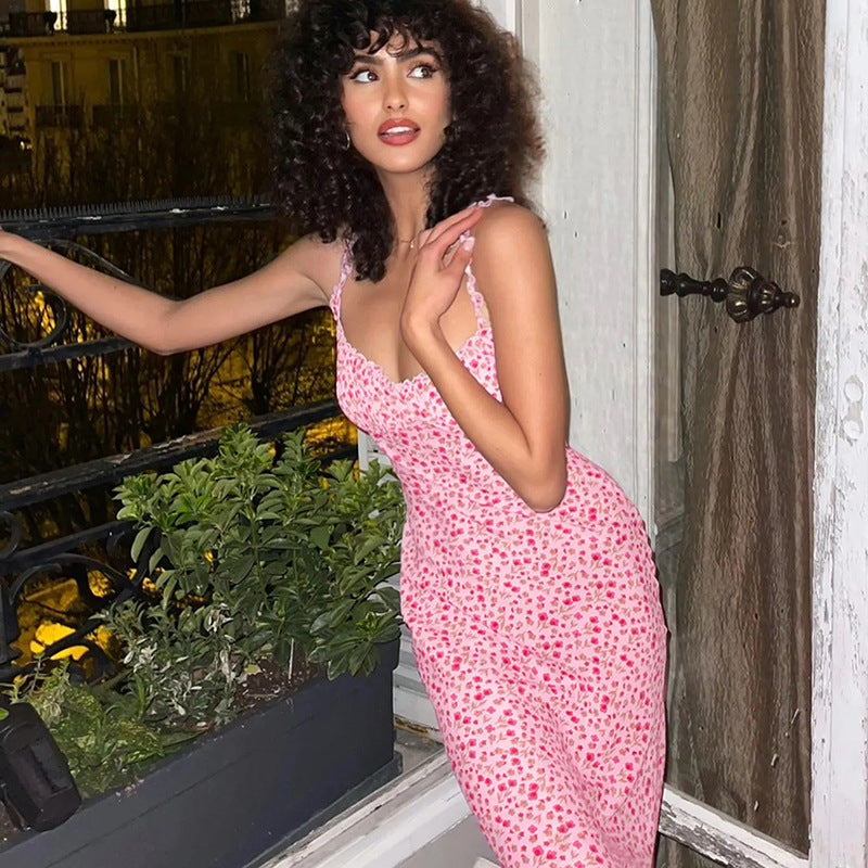 New summer fresh floral print deep V tight fashion sling bag hip dress