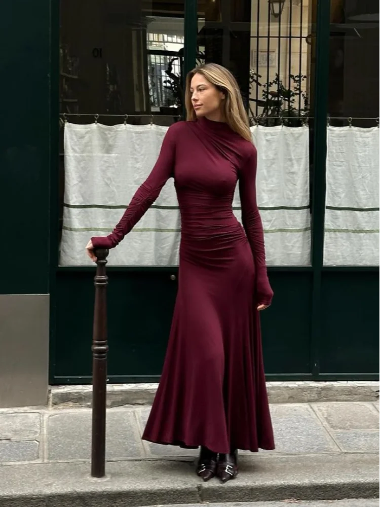 Lady Elegant Burgundy Mock Turtleneck Solid Maxi Dresses Fashion Long Sleeve Slim Hem Party Midi Robe Autumn Evening Dress Women