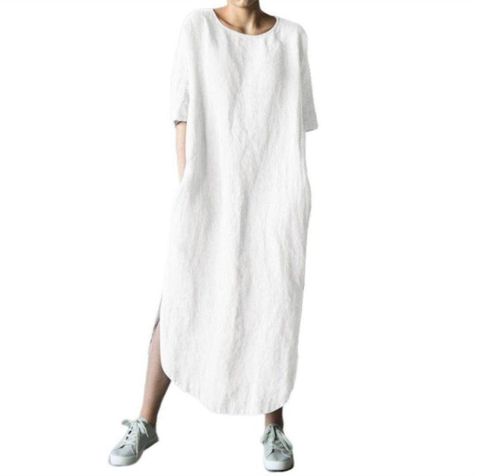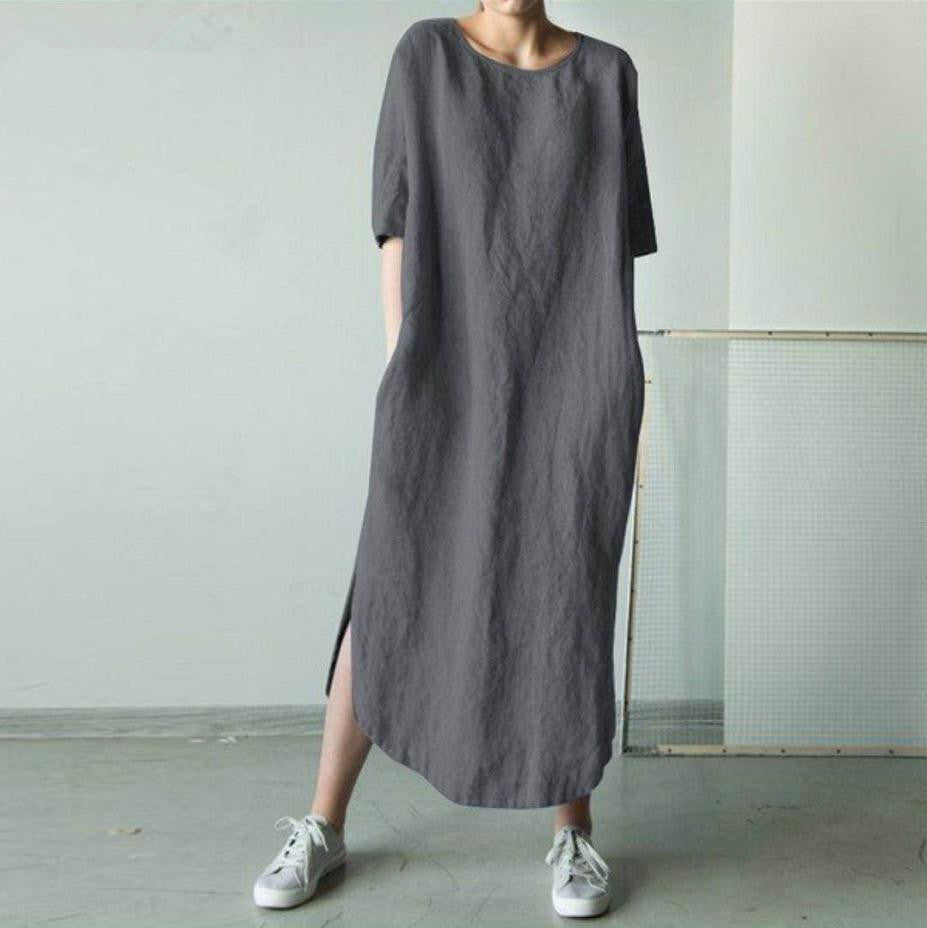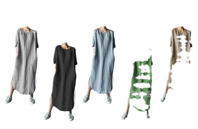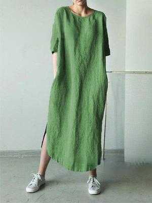 Round Neck Half Sleeve Solid Color Side Slit Mid Calf Cotton Linen Dress for Women