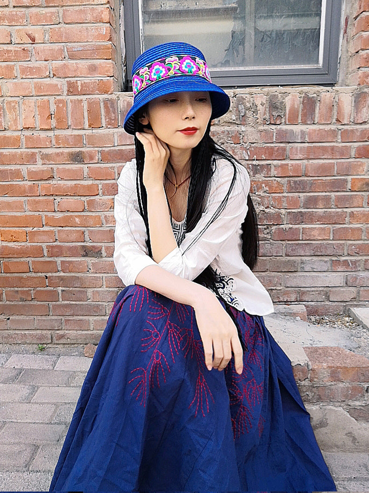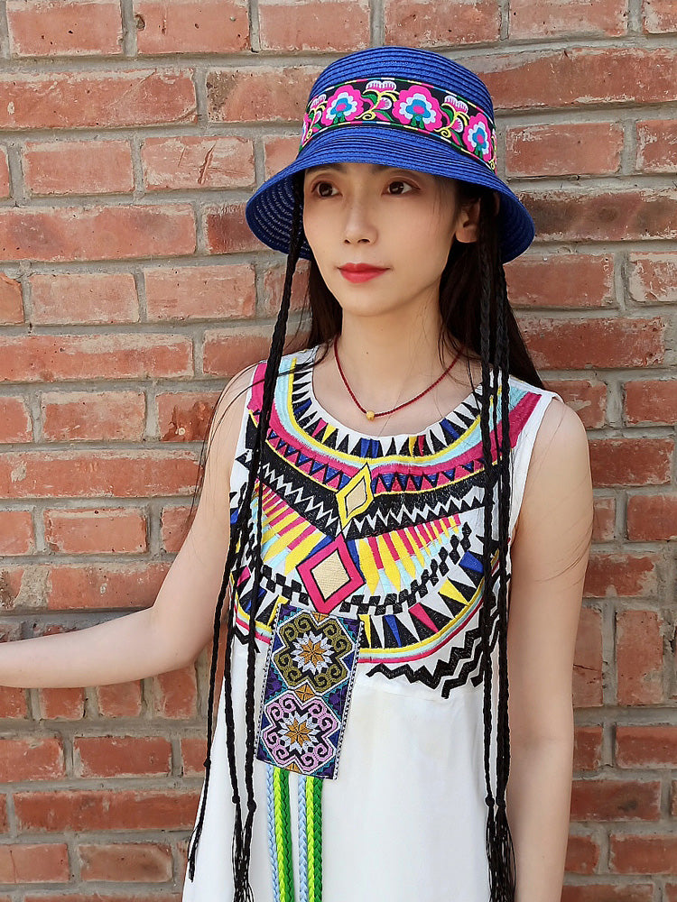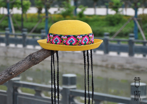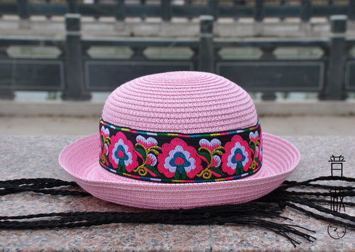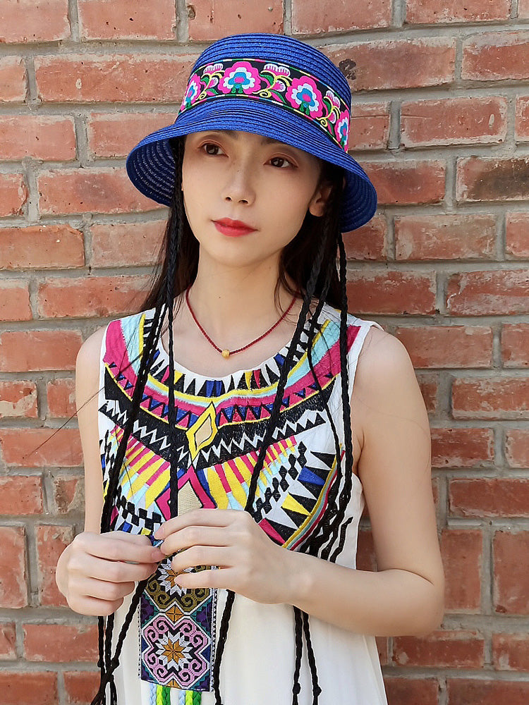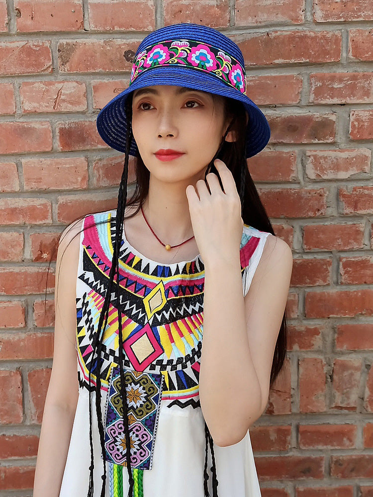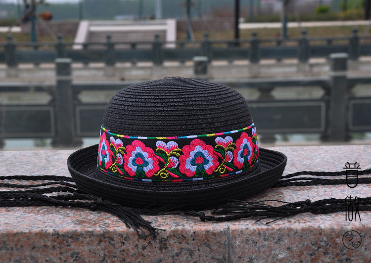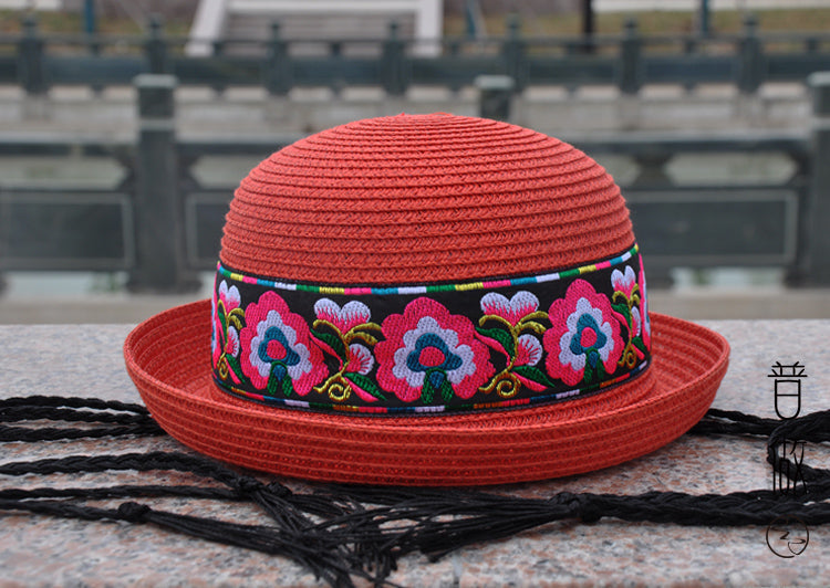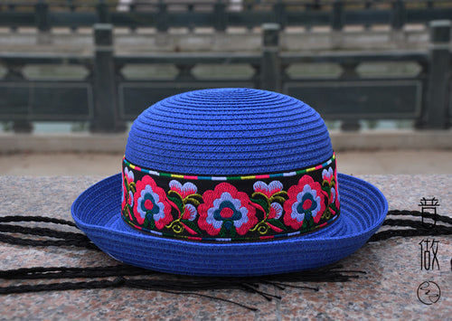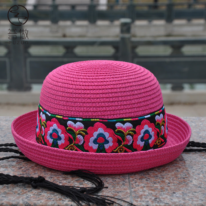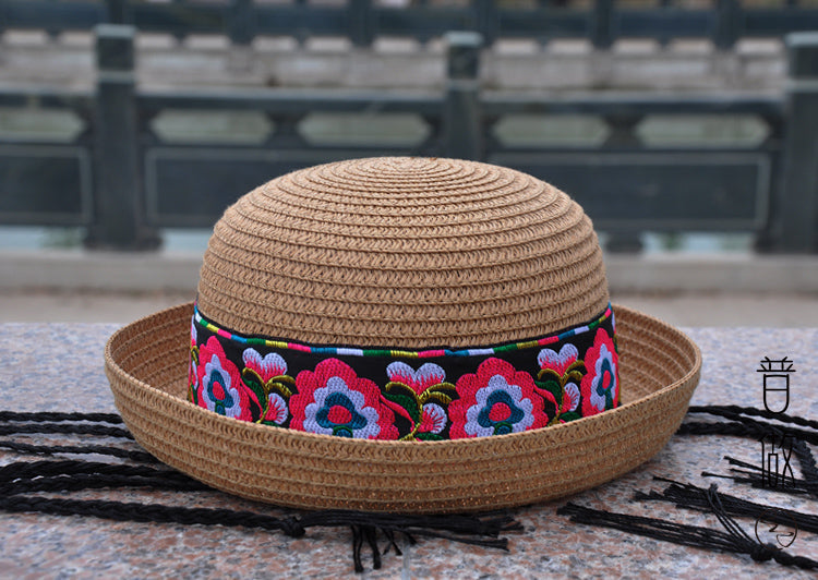New National Style Embroidered Braided Hat, Folding Leisure Straw Hat, Summer Vacation Beach Sunshade Basin Hat
