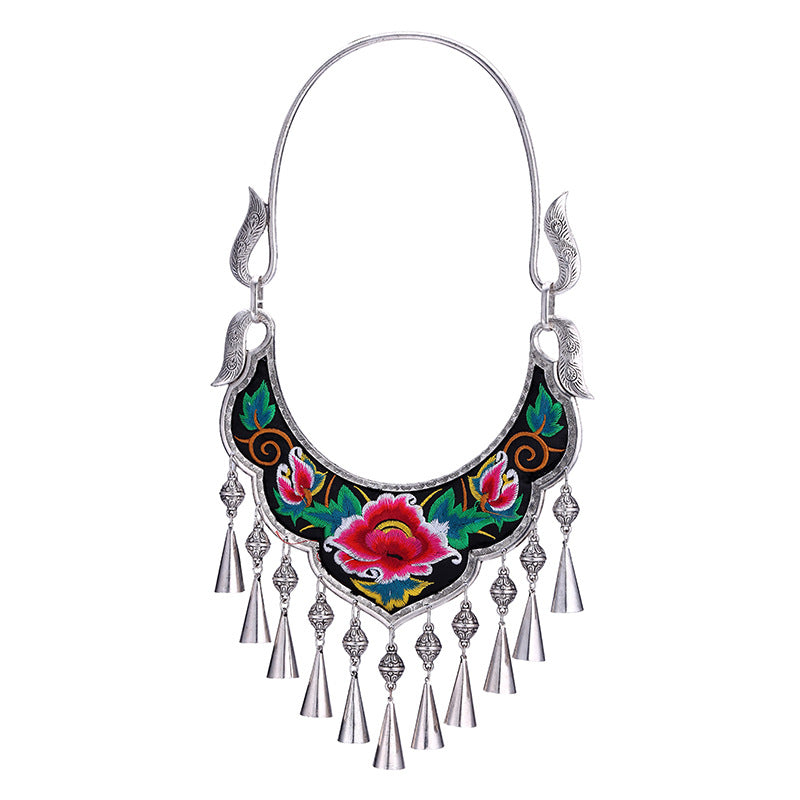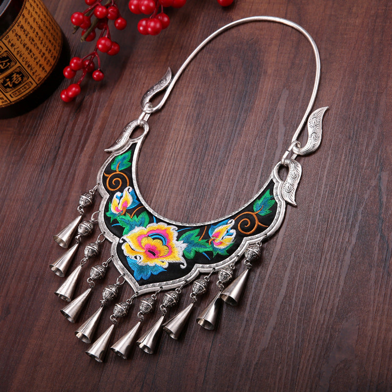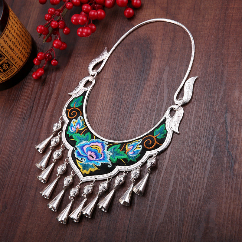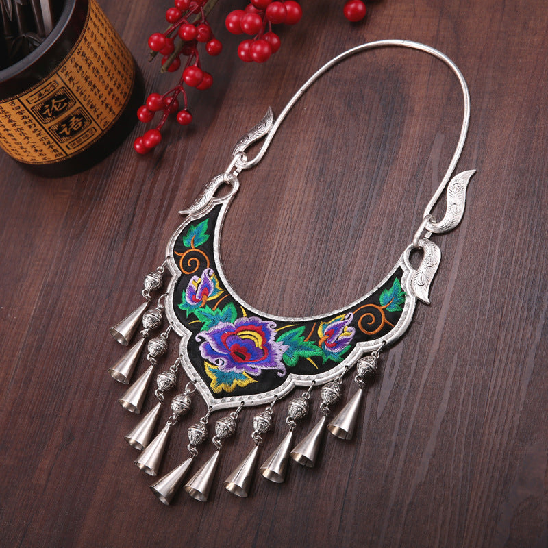 Ethnic Style Exaggerated Miao Silver Embroidery Collar Retro Bell Long Necklace