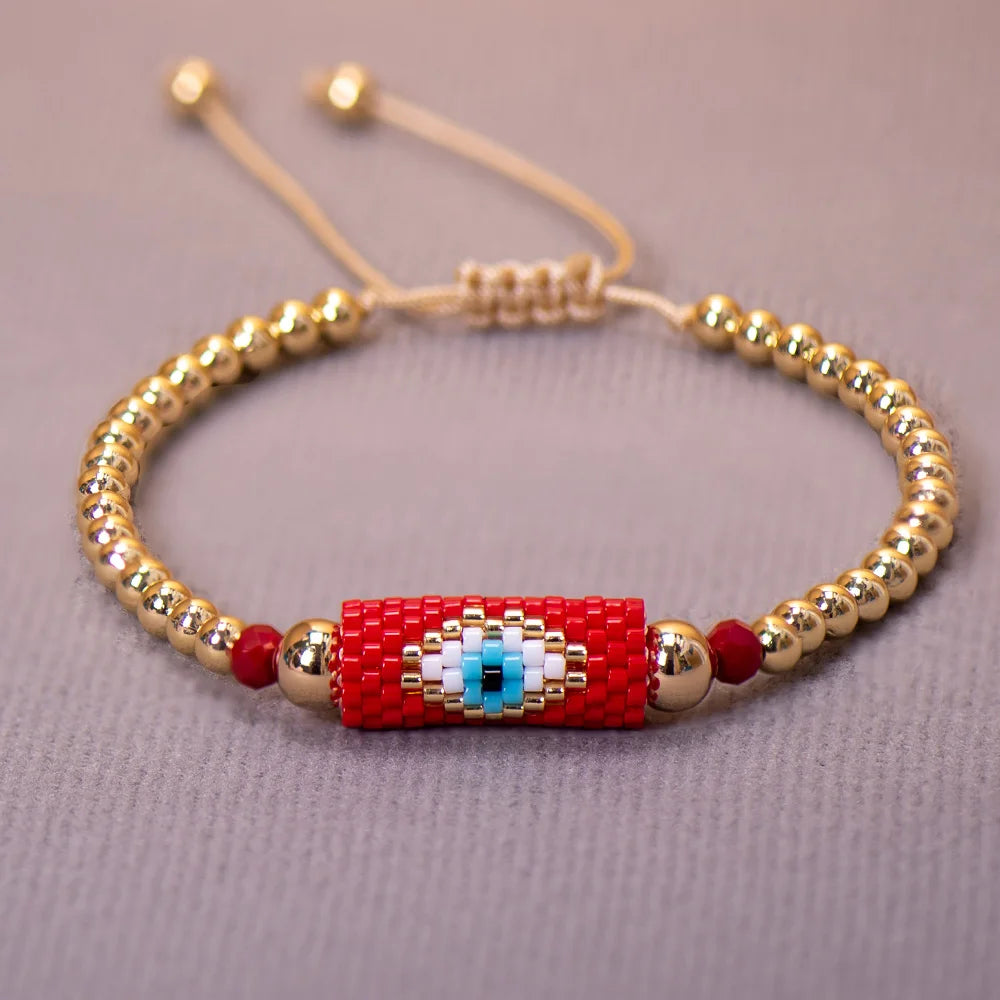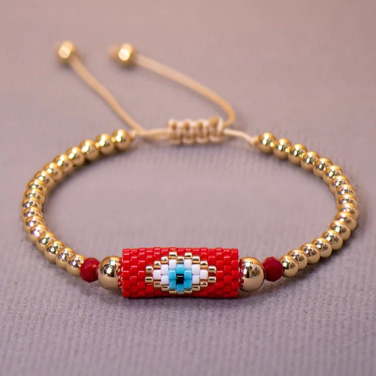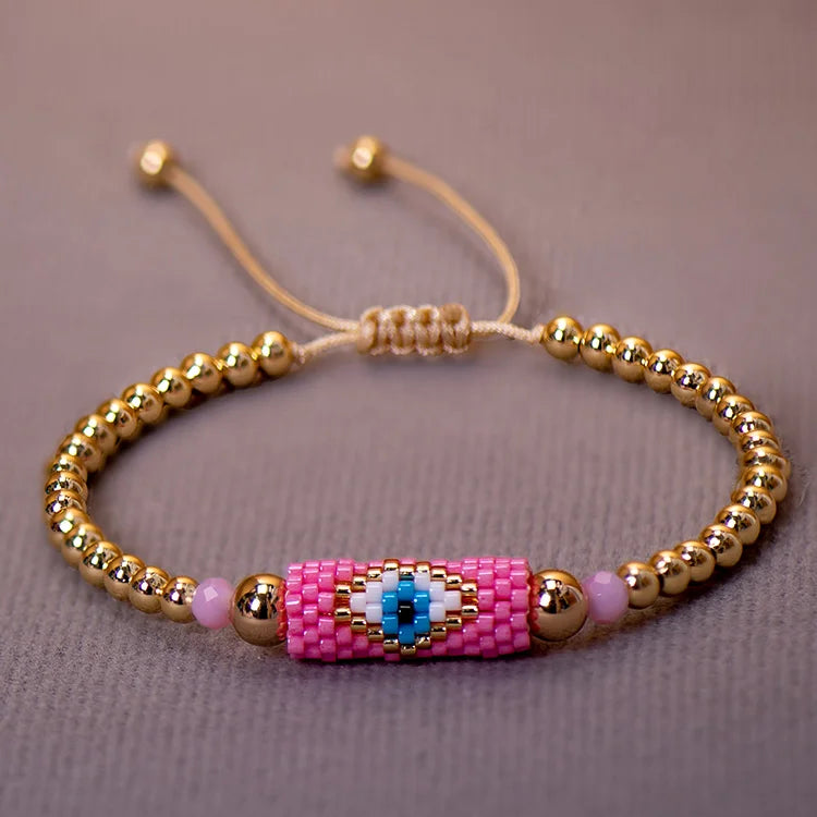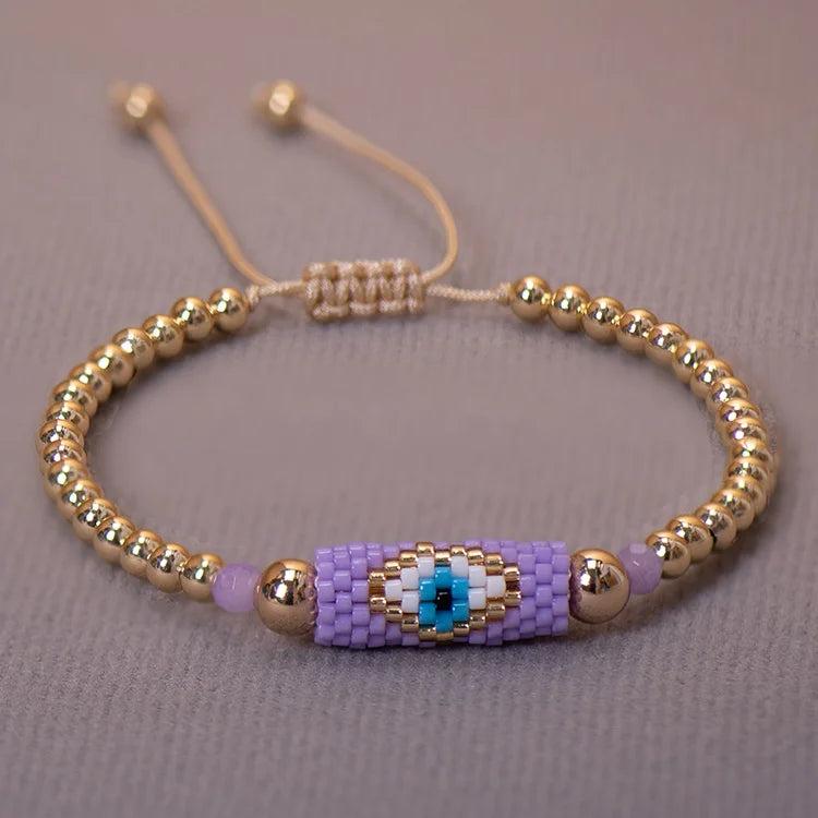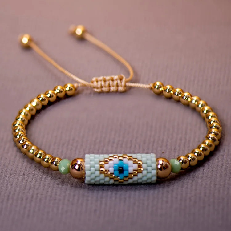 The Miyuki bracelet Turkish eye woman is a bracelet made with Miyuki beads and a Turkish eye charm. Miyuki beads are high-quality glass beads that are characterized by their uniform shape and durable gloss. These beads are commonly used in the manufacture of jewelry and are considered a high quality material.