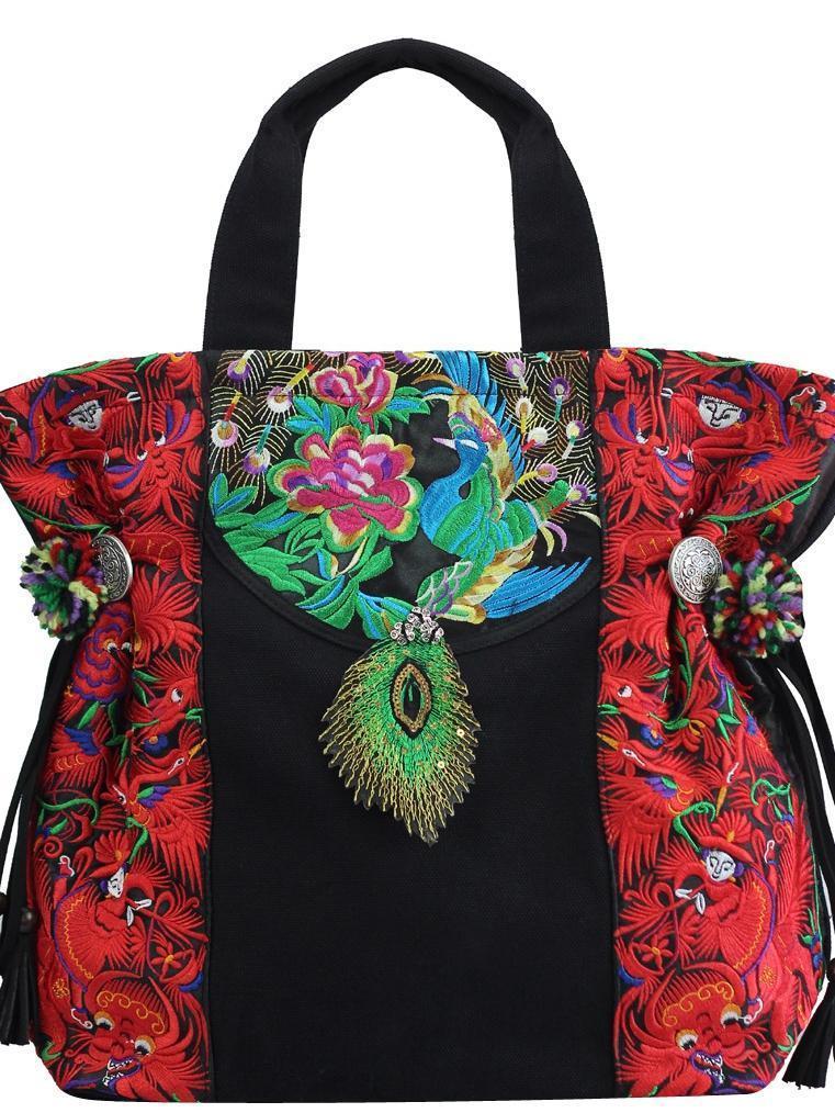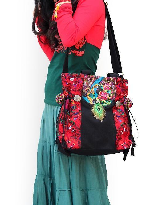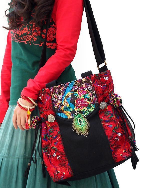 National style retro college literary embroidery one shoulder slung mobile handbag peacock