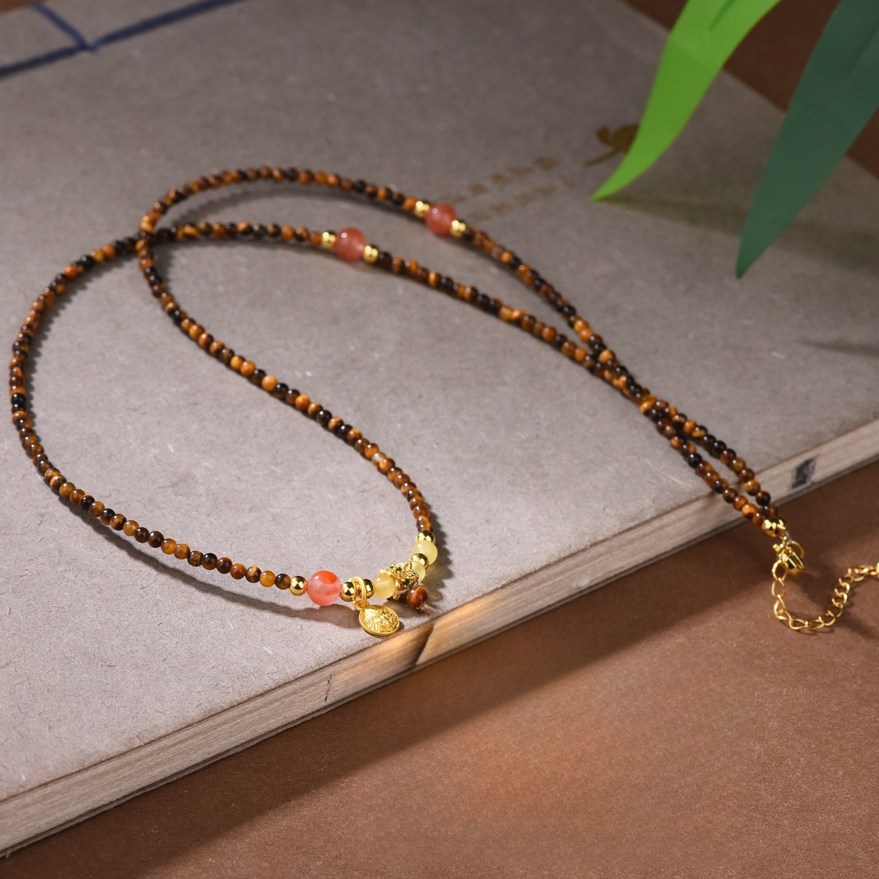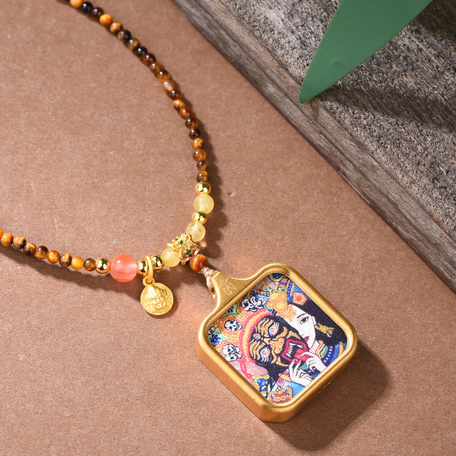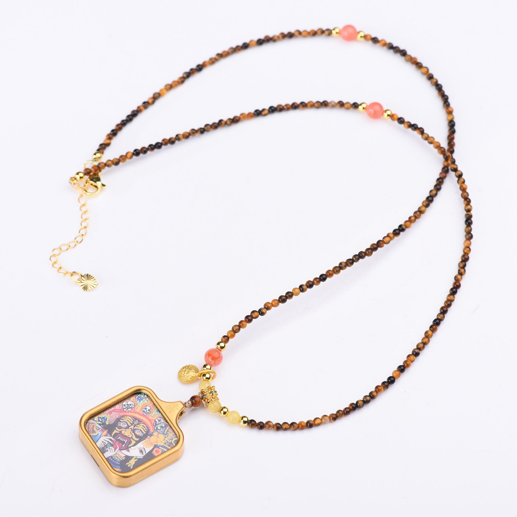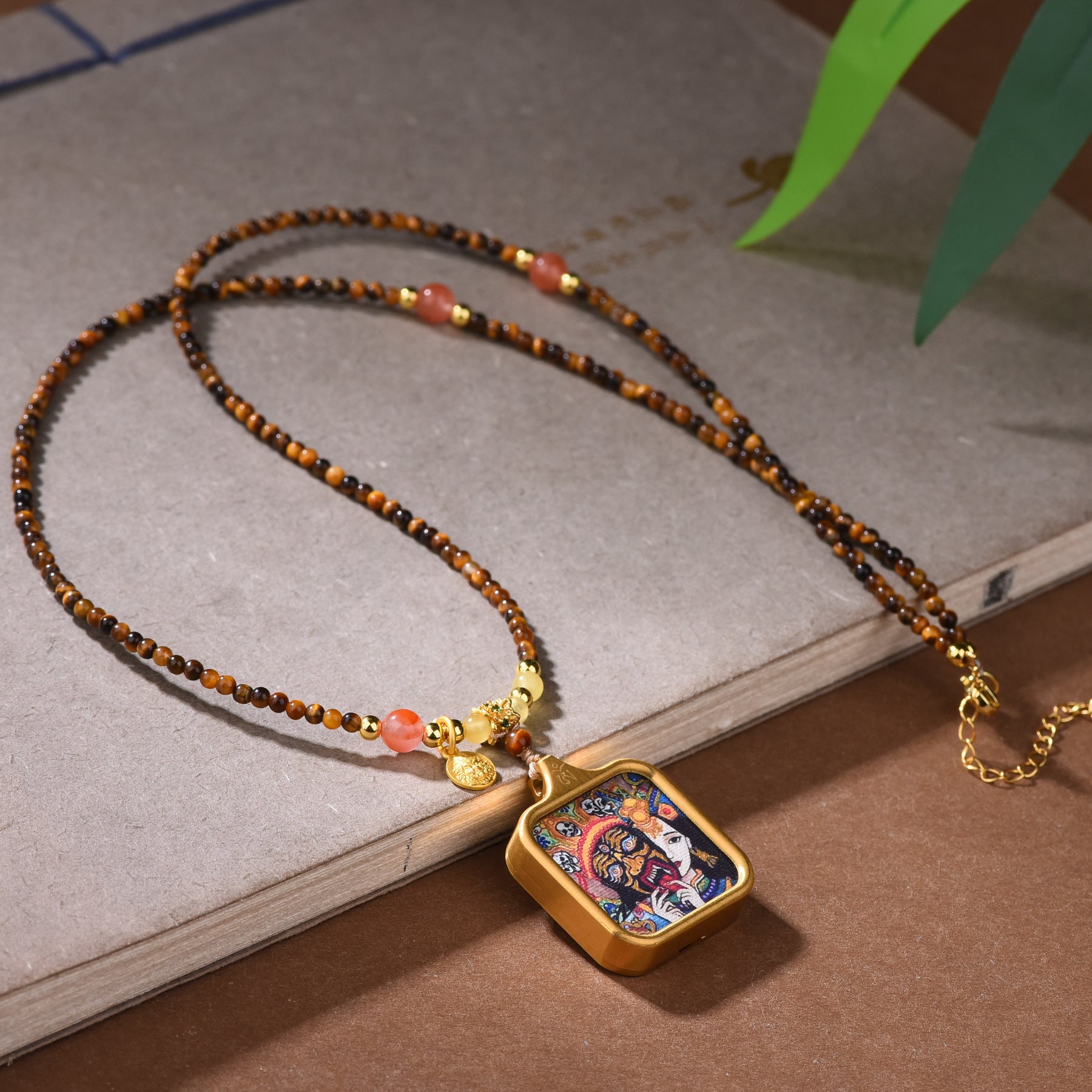 New Tibetan Natural Tiger's Eye Stone Necklace Tibetan Style Zakiram God of Wealth Thangka Pendant Collarbone Chain Simple Light Luxury Decoration
