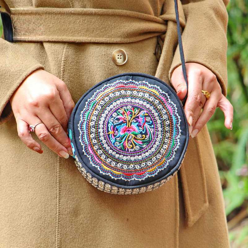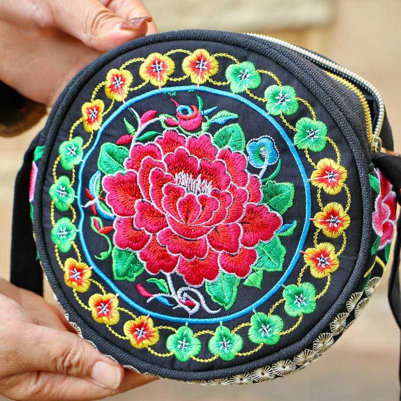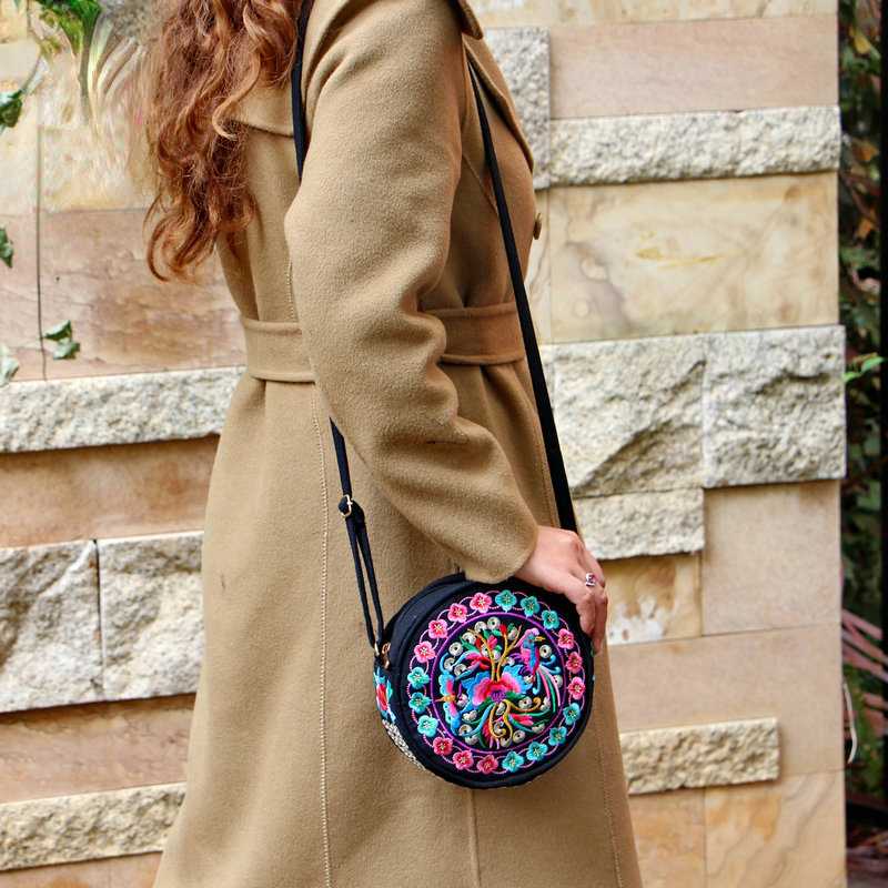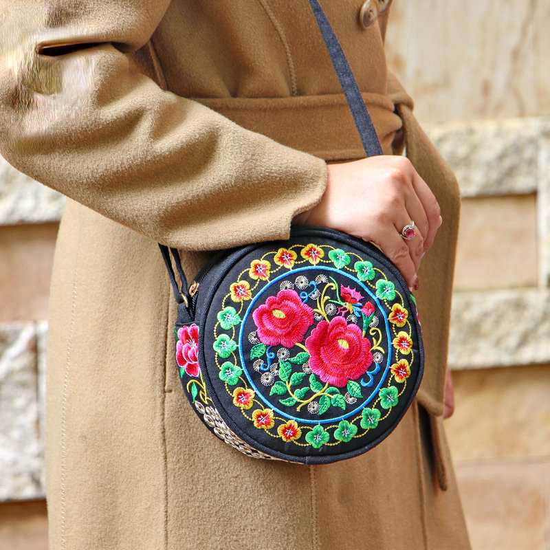 New Ethnic Style Embroidery Bag Retro Canvas Leisure Small Round Bag Women's Bag Exquisite One Shoulder Oblique Straddle Bag