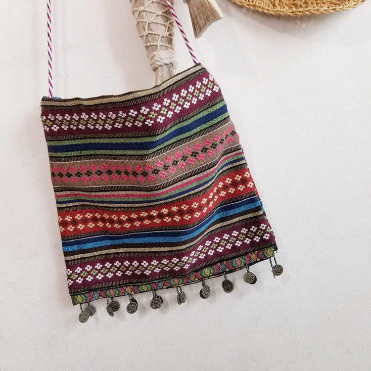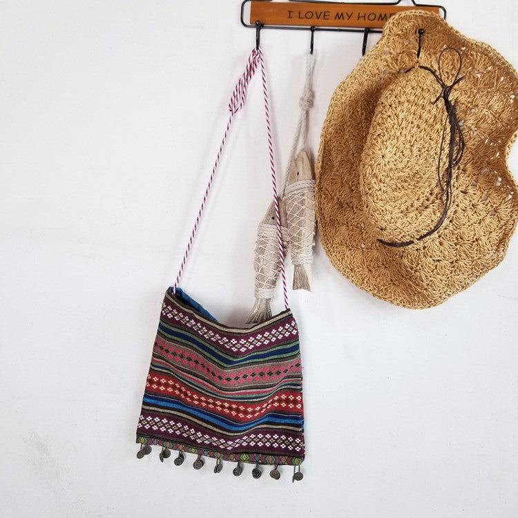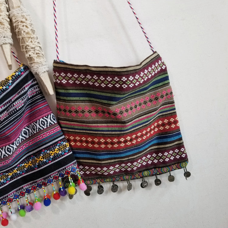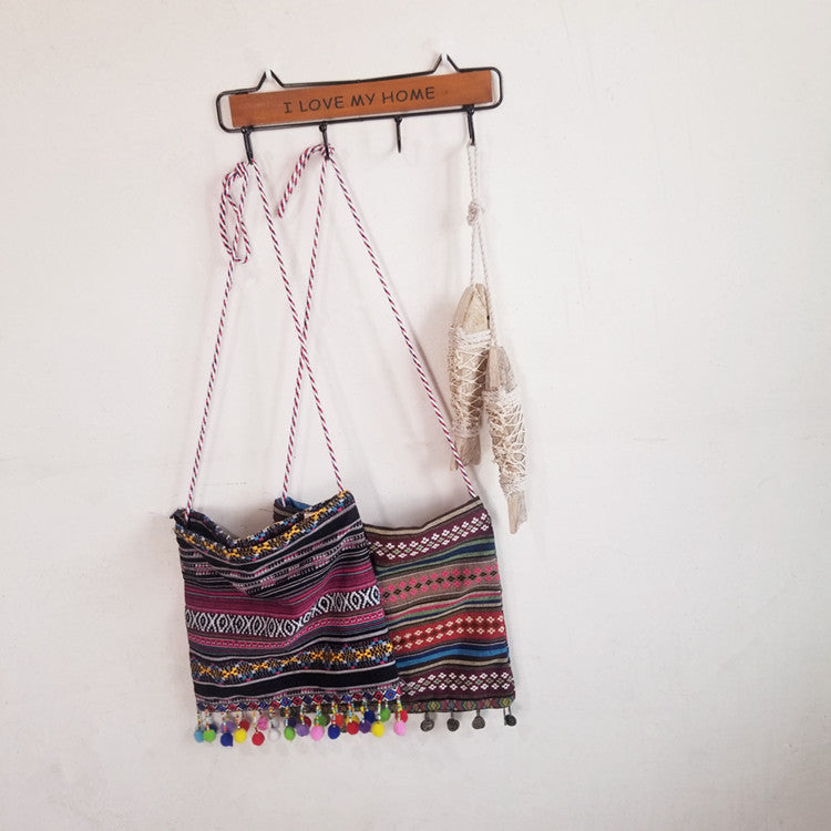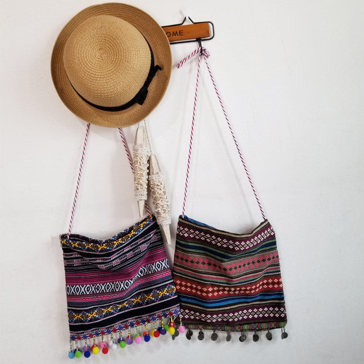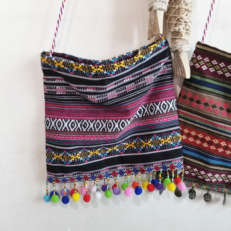 New Handmade Original Retro Storm Bohemian Canvas Bag Ethnic Style Fur Ball Tassel Crossbody Bag Shoulder Bag