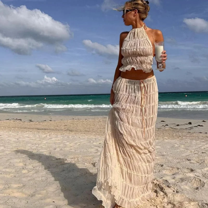 Pleated Crop Tops Long Skirt Suit Women Halter Sleeveless Backless Skirts Set 2024 Summer Ladies Sexy 2 Piece Set Beach Outfit