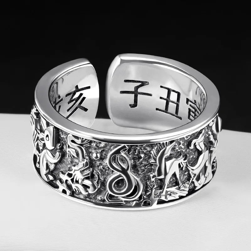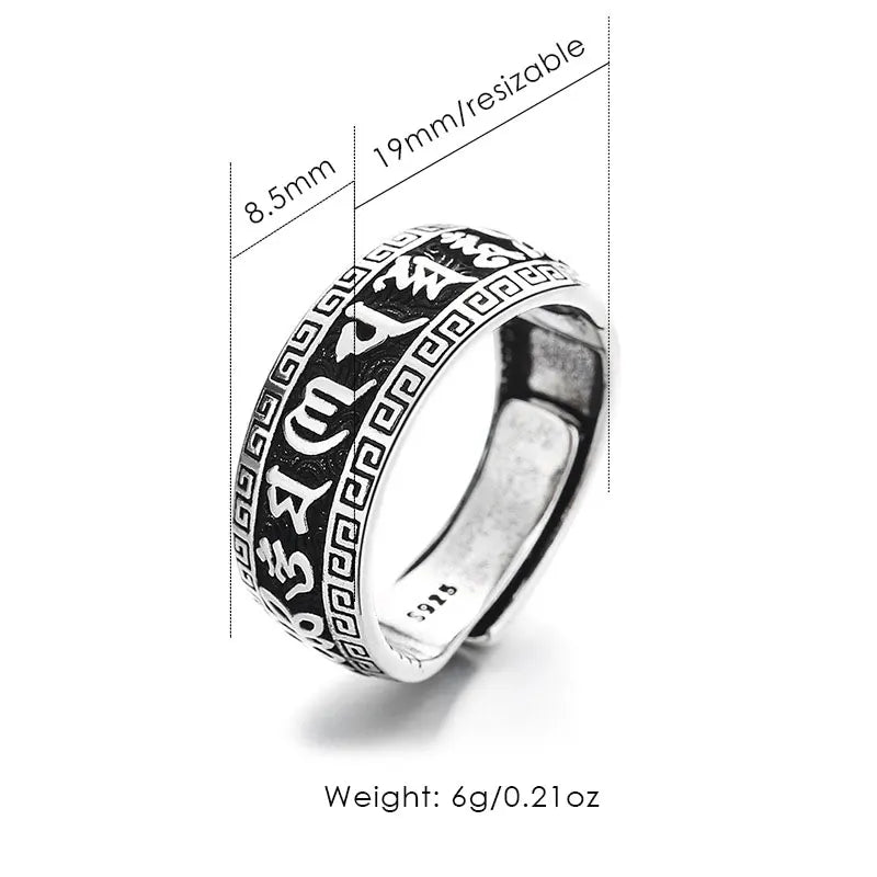 Retro Ancient Silver Plated Buddhist Six Character DAMING Mantra Tibetan Resizable Ring for Men Feng Shui Amulet Protection Ring