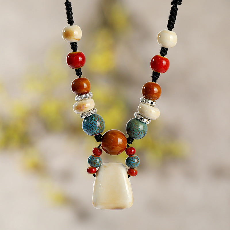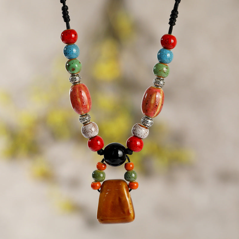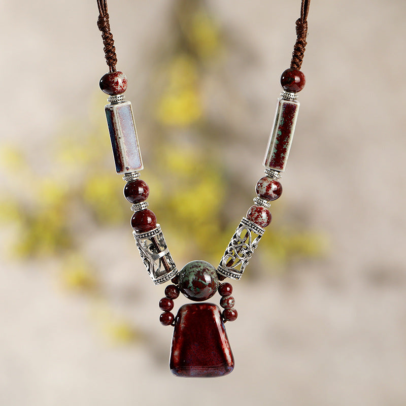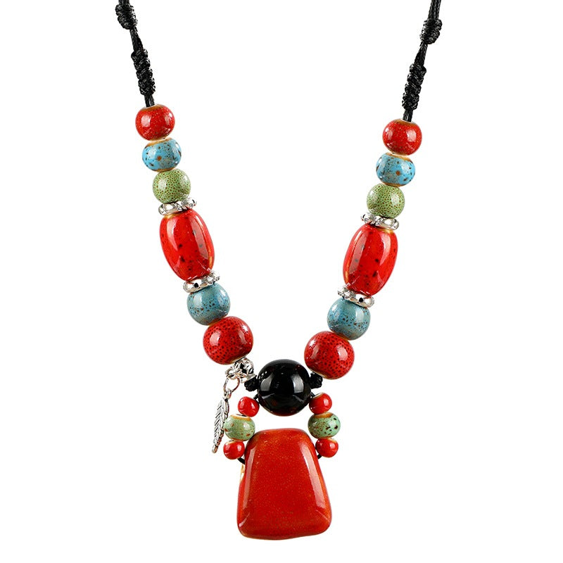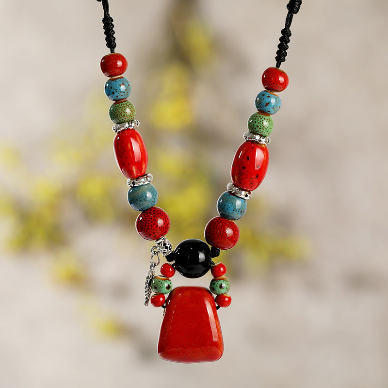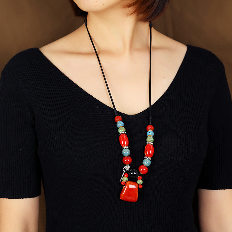 Retro Ethnic Style Ceramic Necklace for Women's Simple Collar Chain Versatile Red Pendant Long Sweater Chain Pendant Accessories