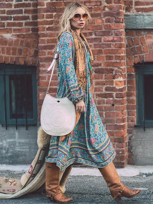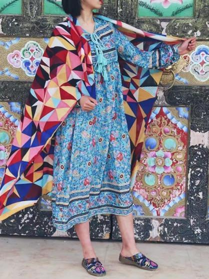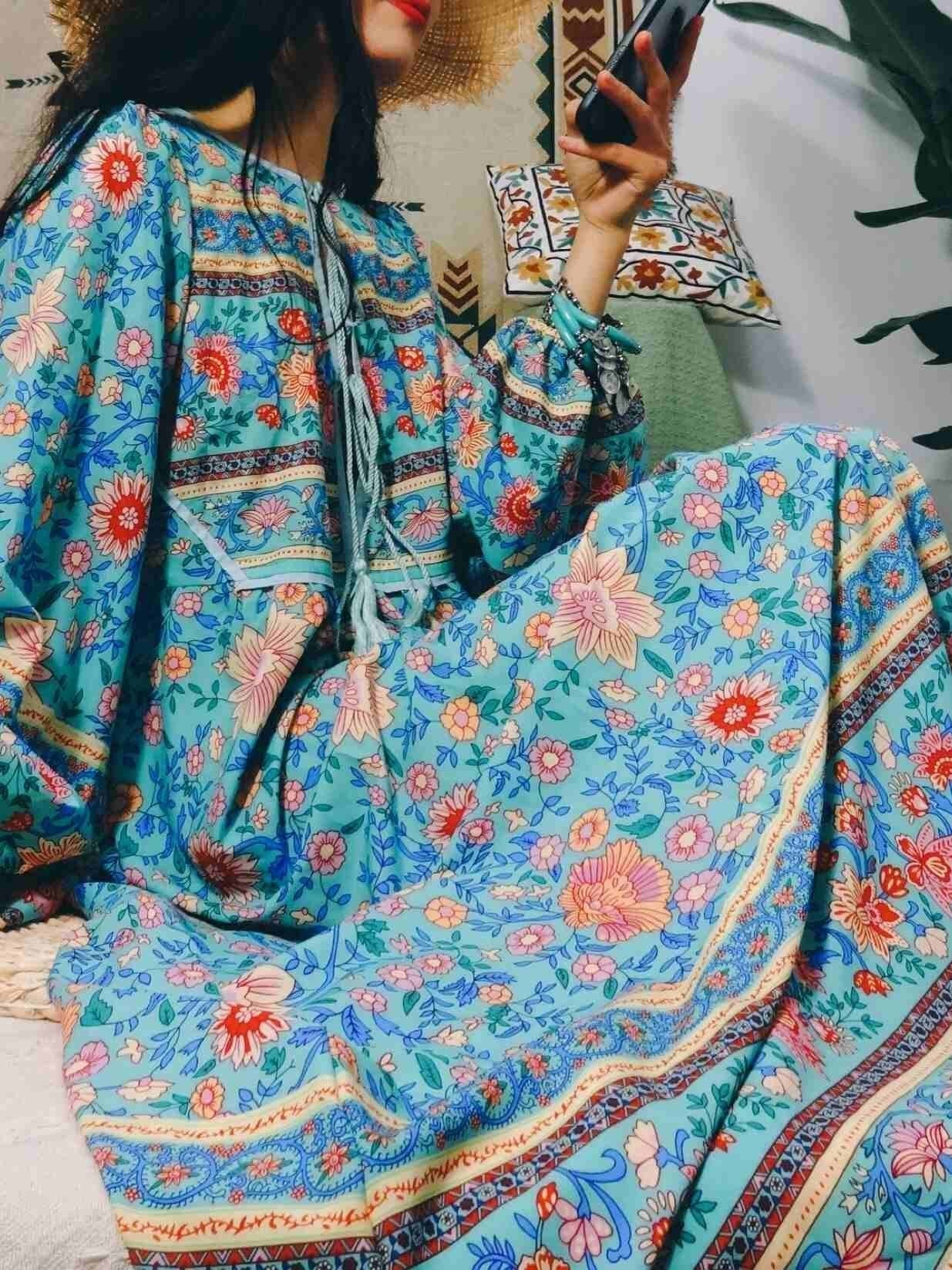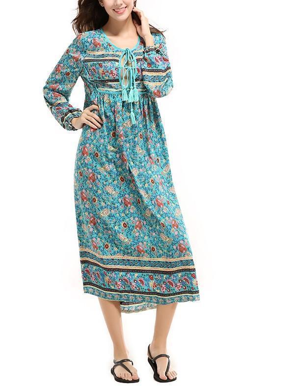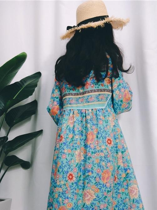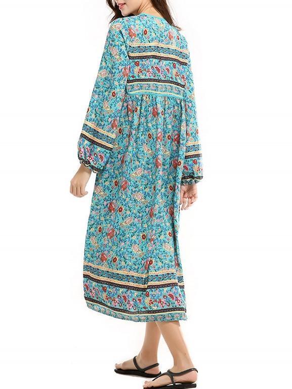 Romantic Blue Floral 3/4 Sleeve Bohemia Dress Maxi Dress