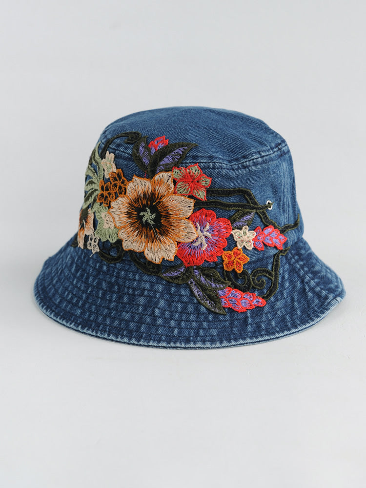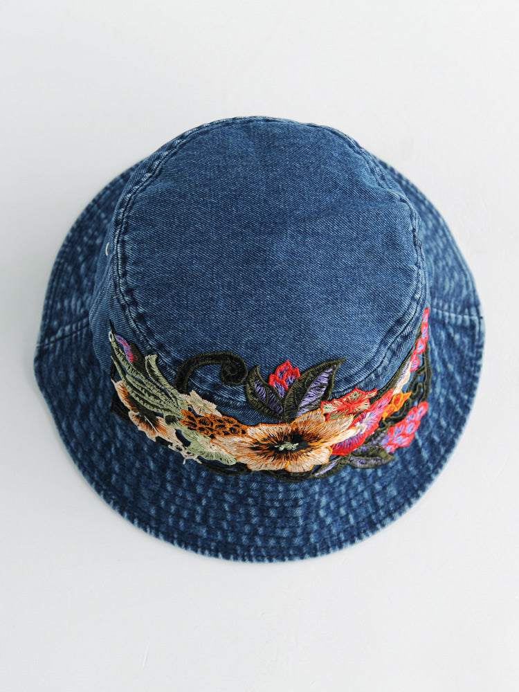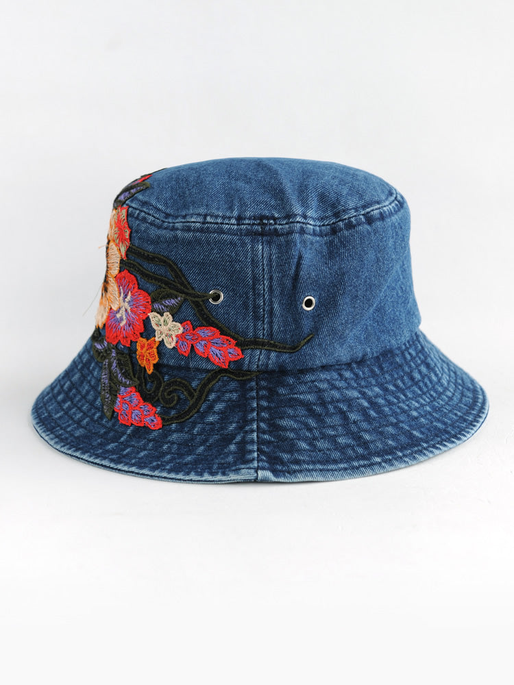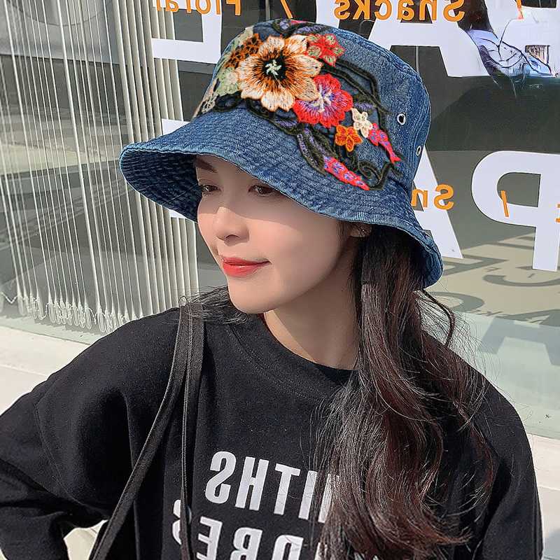 Fashion National Style Embroidered Denim Fisherman Hat Outdoor Sun Protection Travel Street Basin Hat.