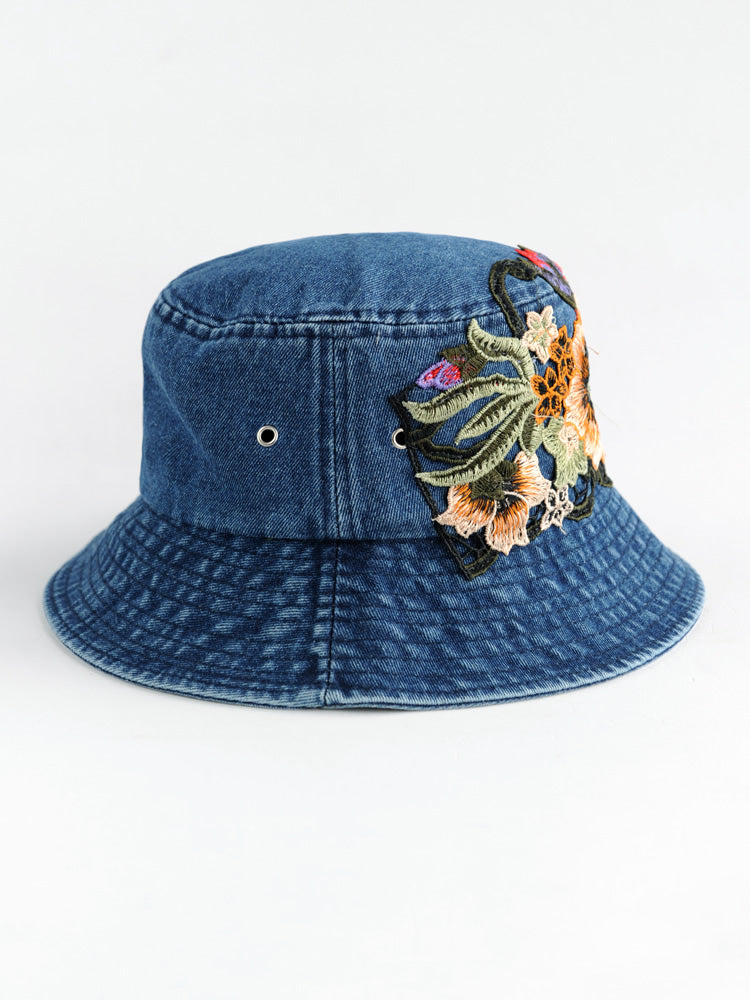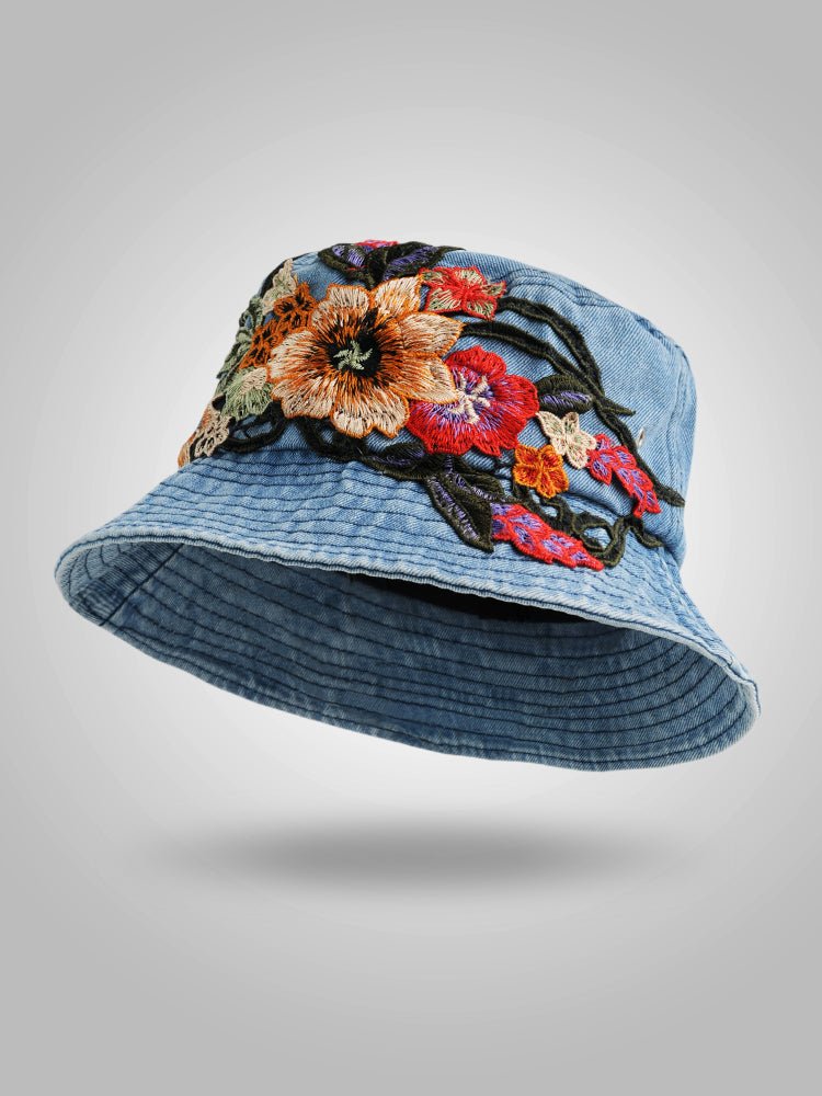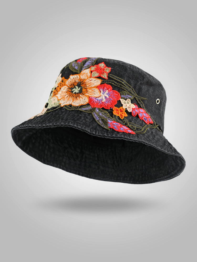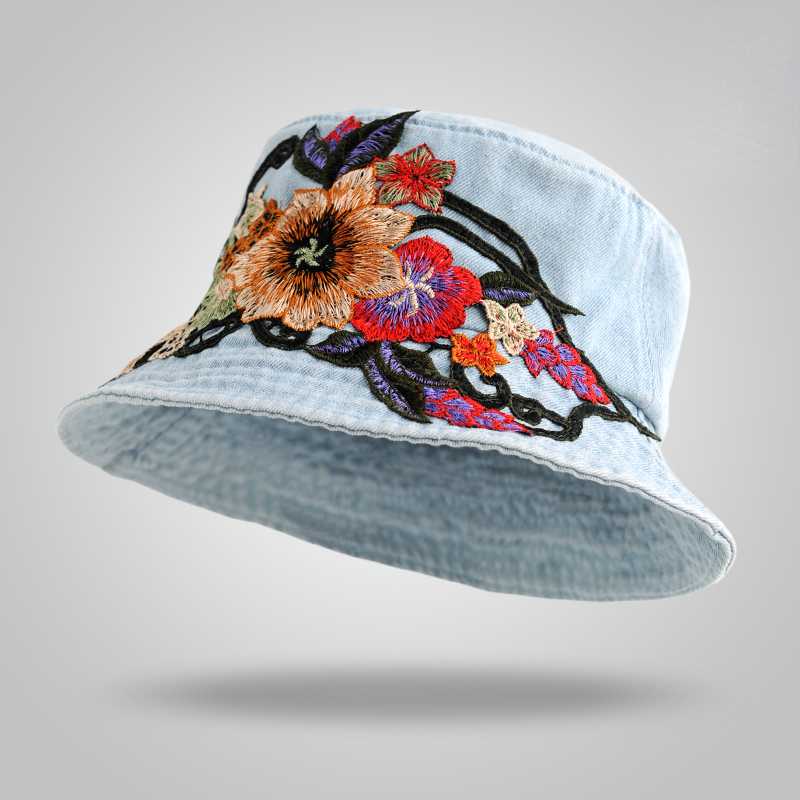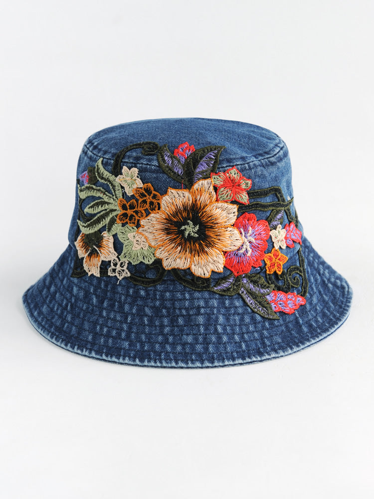 Fashion National Style Embroidered Denim Fisherman Hat Outdoor Sun Protection Travel Street Basin Hat.