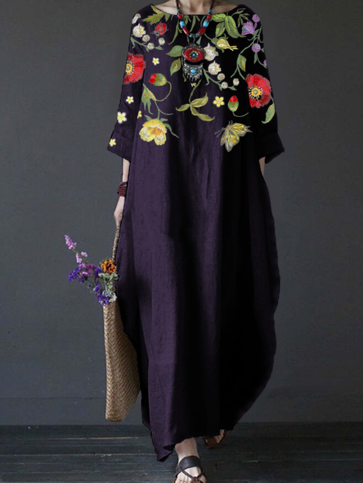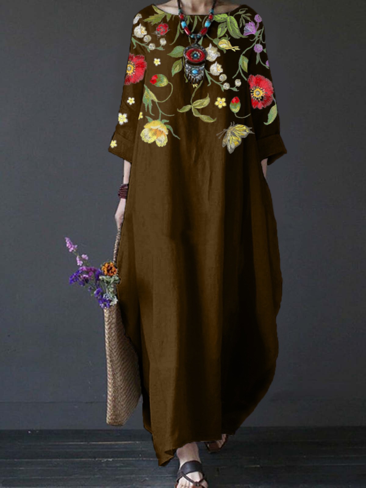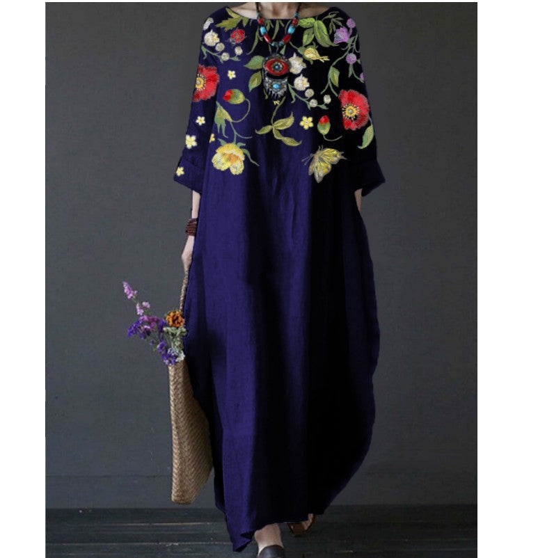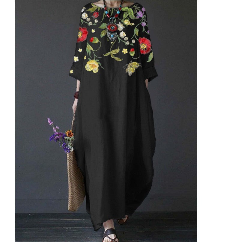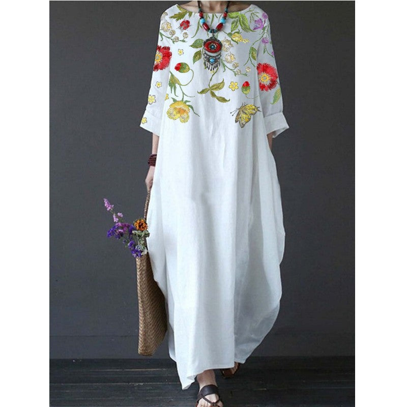 Summer Feminine Style Long Dress Round Neck Vintage Sweet Print Art Dress 3/4 Sleeve