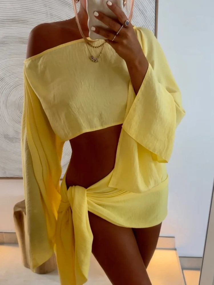 Summer Lady Highstreet Outfits Cotton Linen Long Pagoda Sleeve Crop Top Women 2 Piece Set One Piece Twisted Knot Mini Skirt Suit