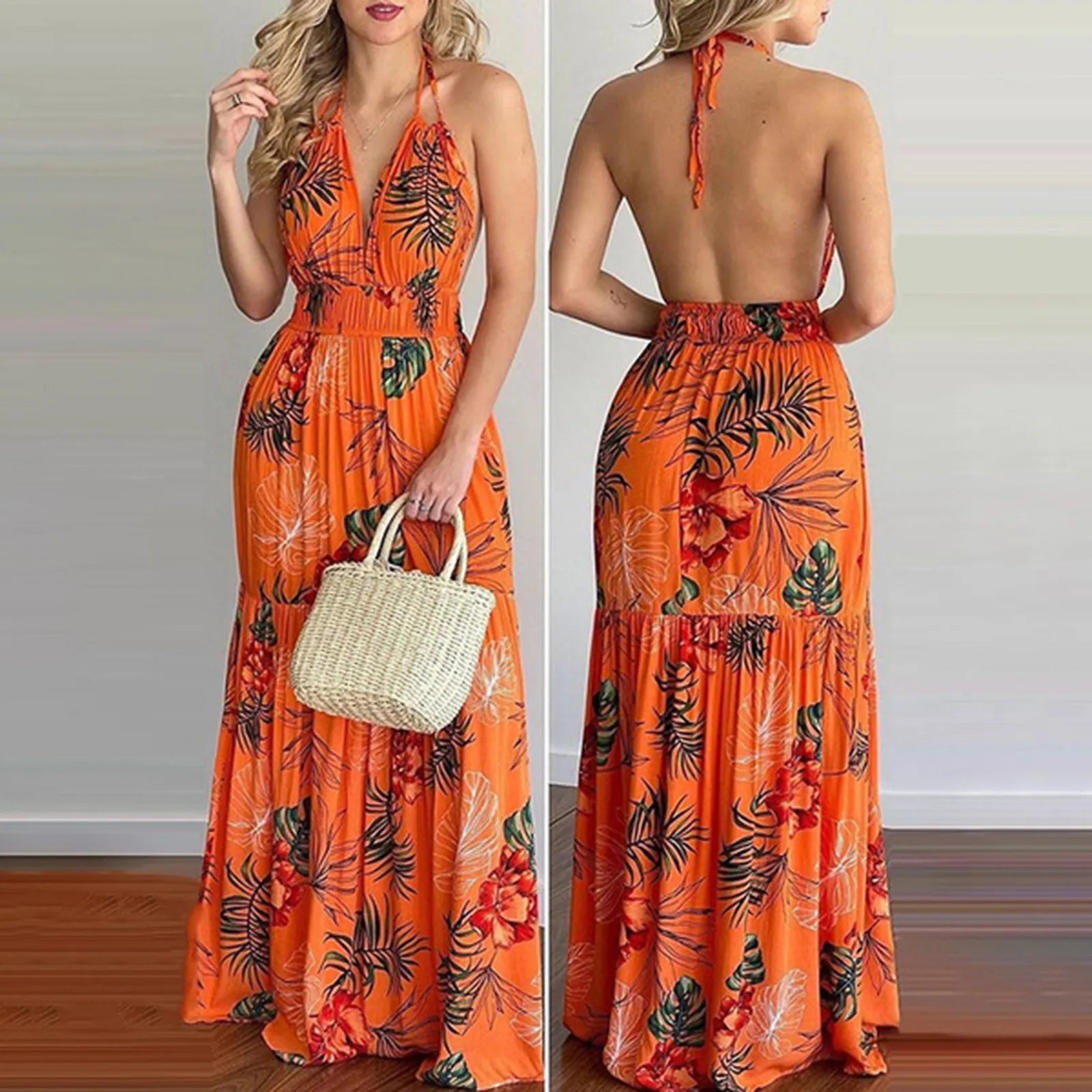 Women Tropical Print Halter Backless Maxi Dress Sexy Sleeveless Beach Dress