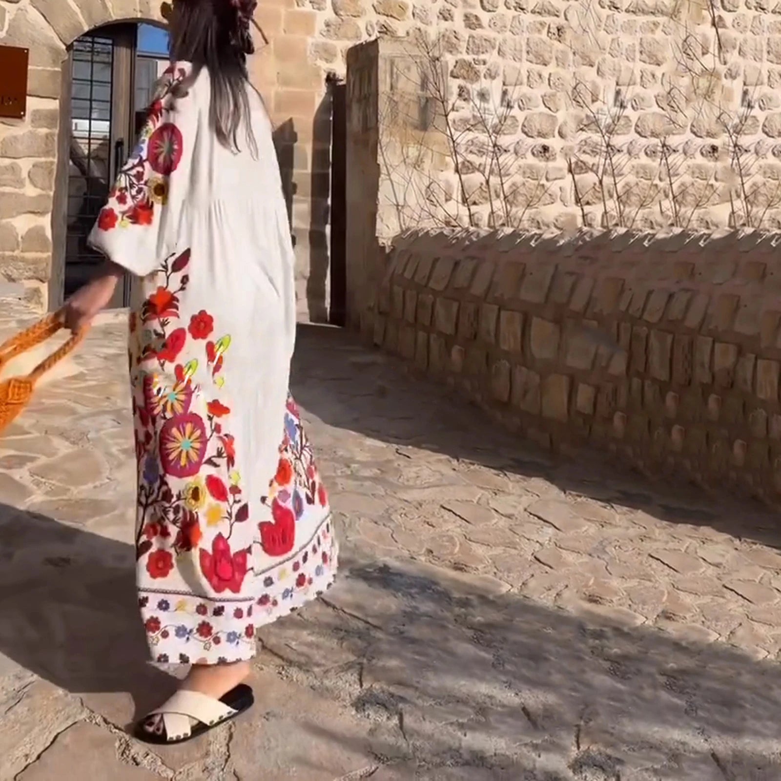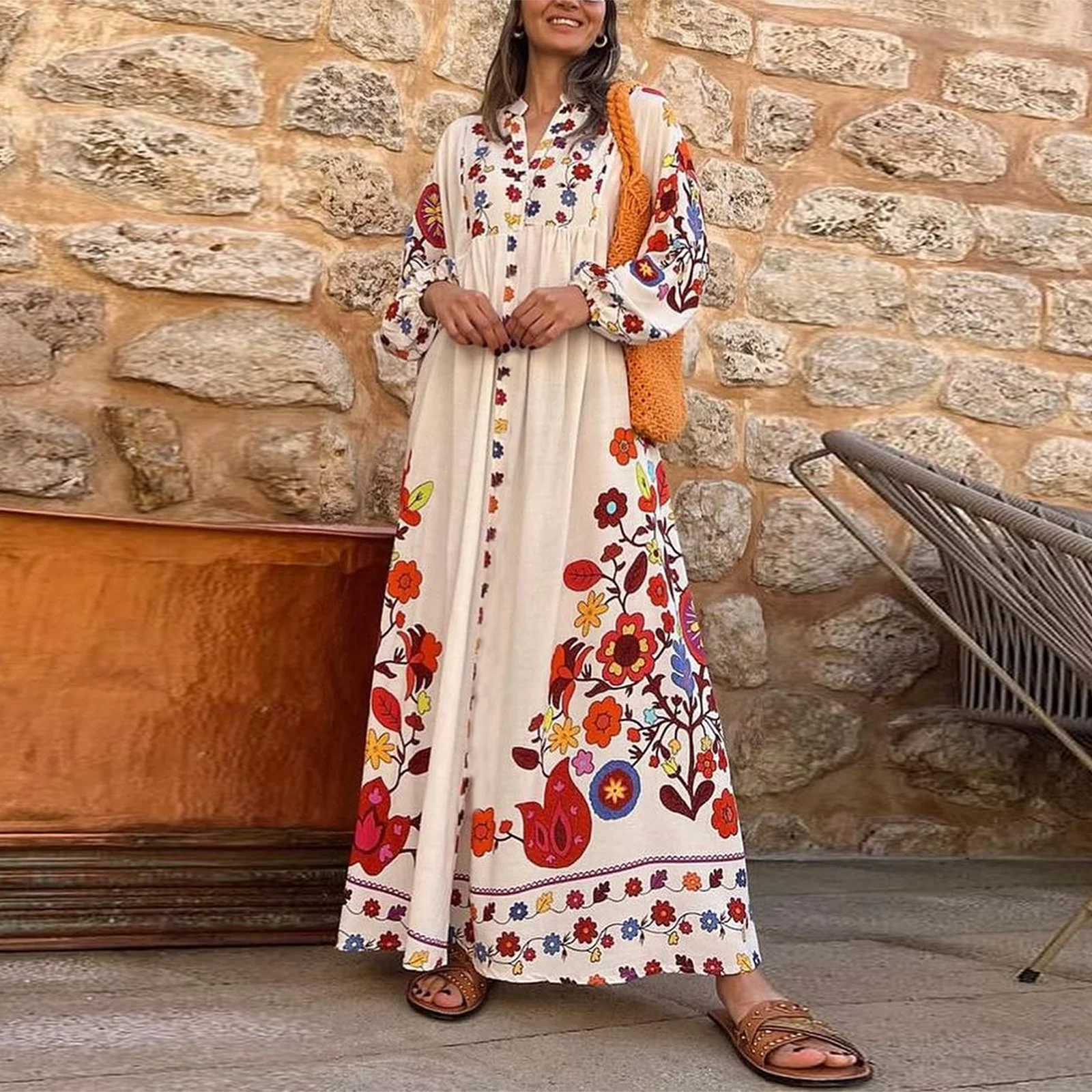 Summer V-neck Flower Print Loose Casual Fall Swing Dress Women Long Dress Long Sleeve Dress