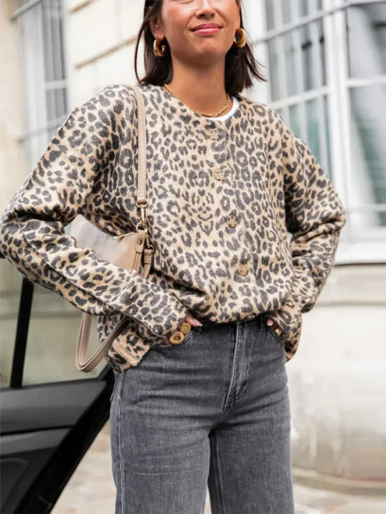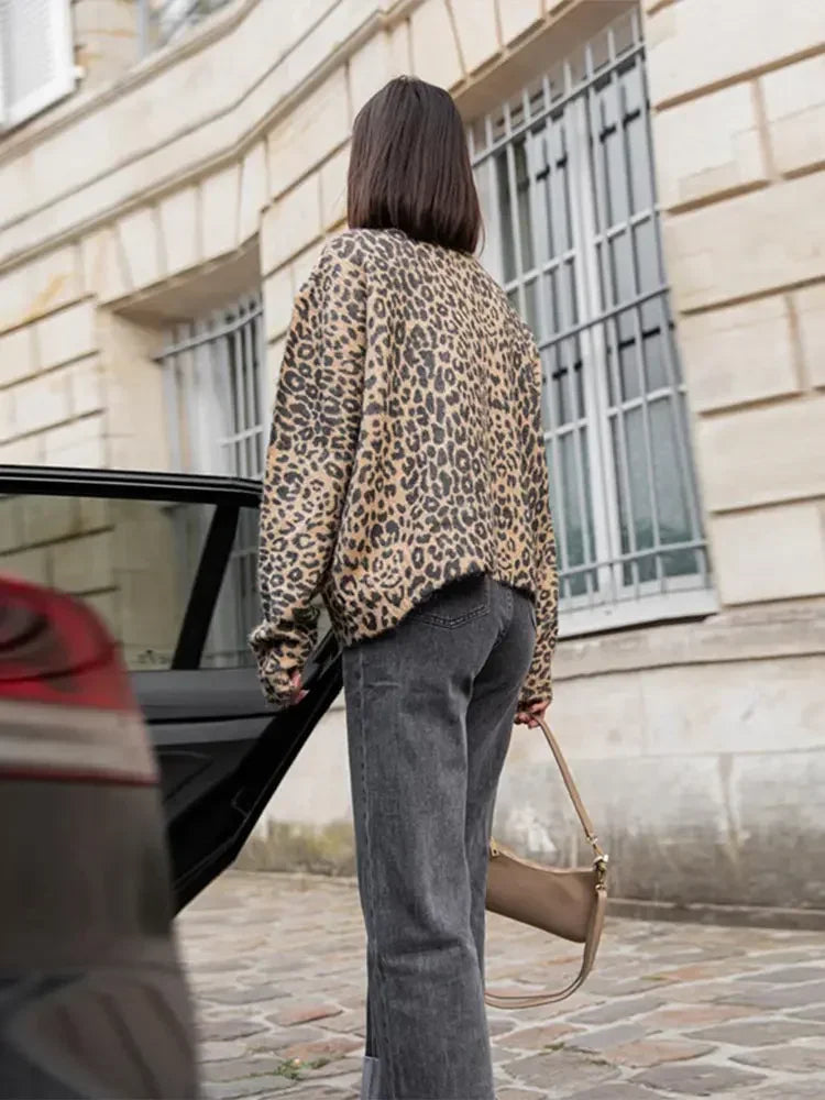 Vintage Leopard Print Single Breasted Women's Cardigan Fashion O Neck Long Sleeved Short Cardigans 2024 Casual Lady Streetwear