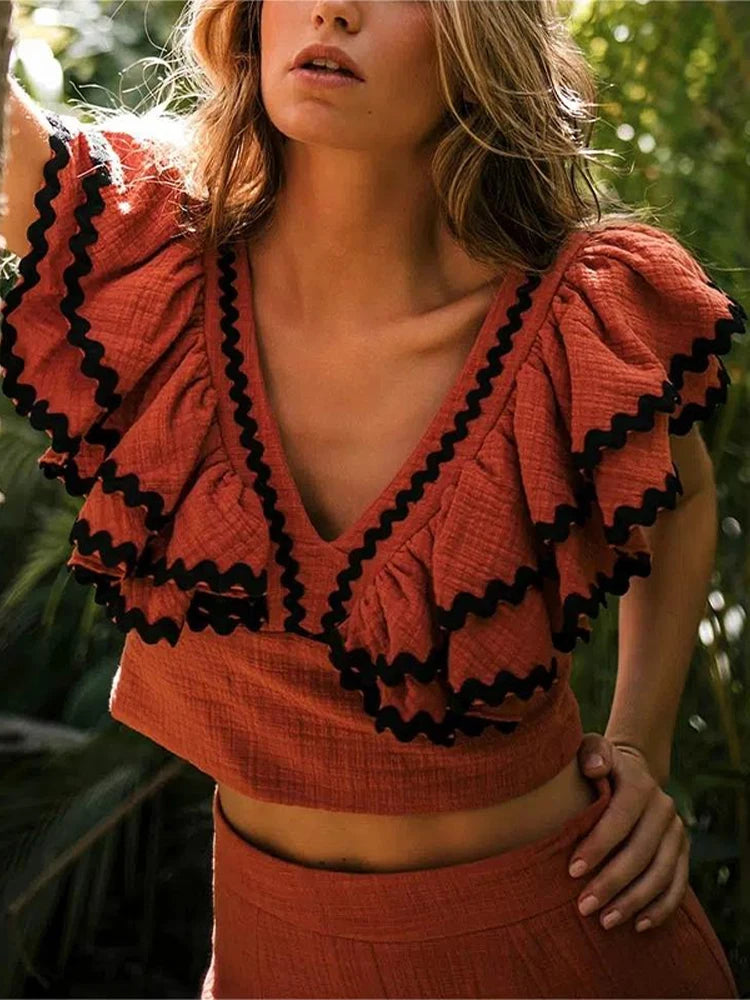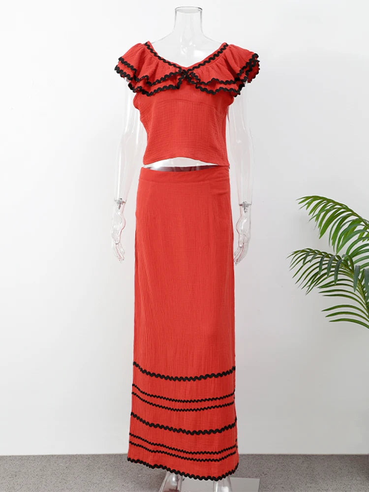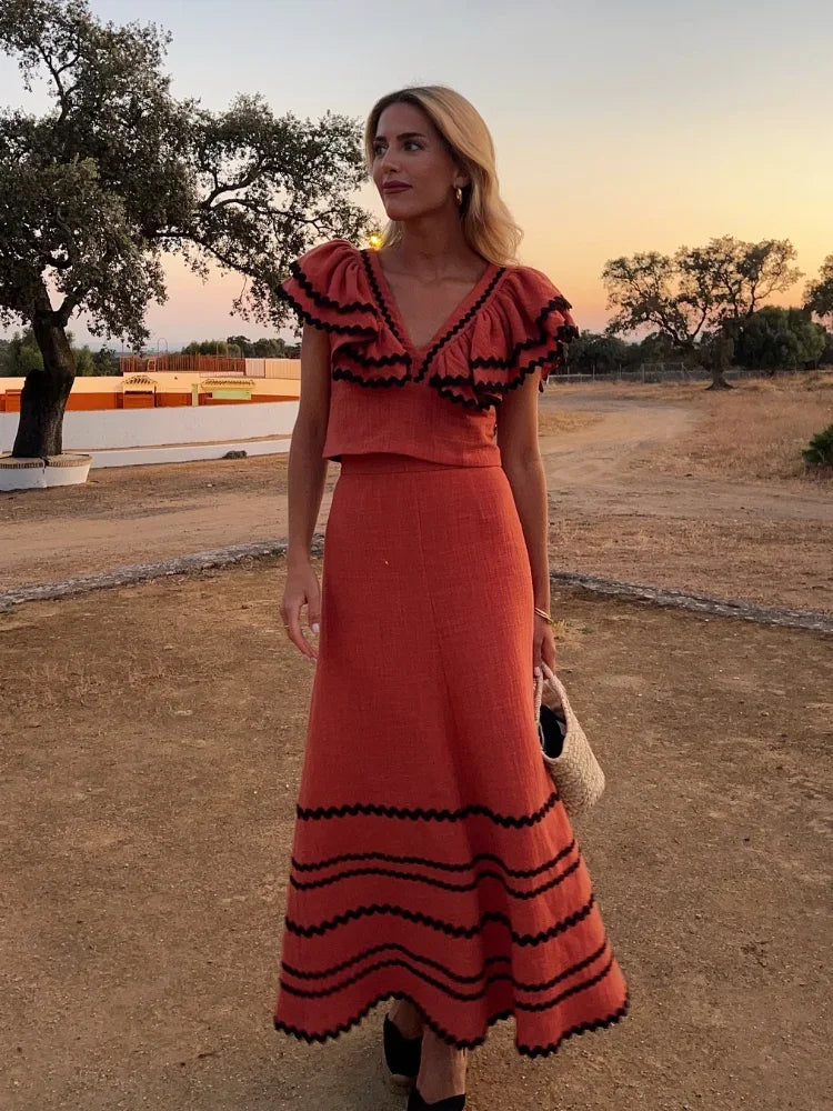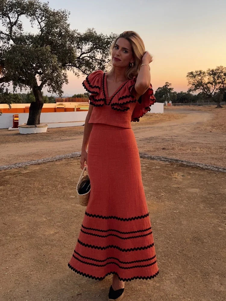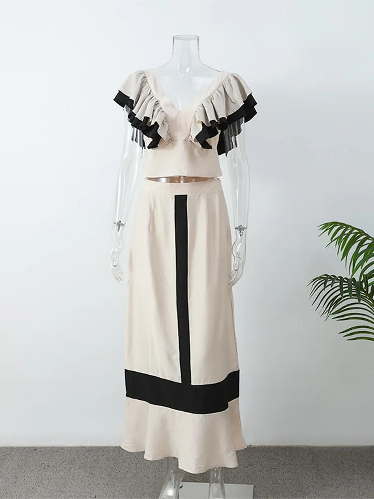 Women Elegant Wave Edge High Waist Long Skirt Suits Fashion V Neck Ruffles Fly Sleeves Crop Top Sets 2024 Female Chic Streetwear