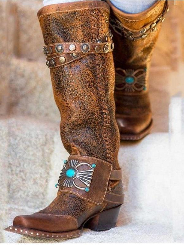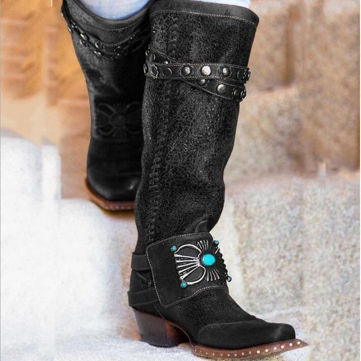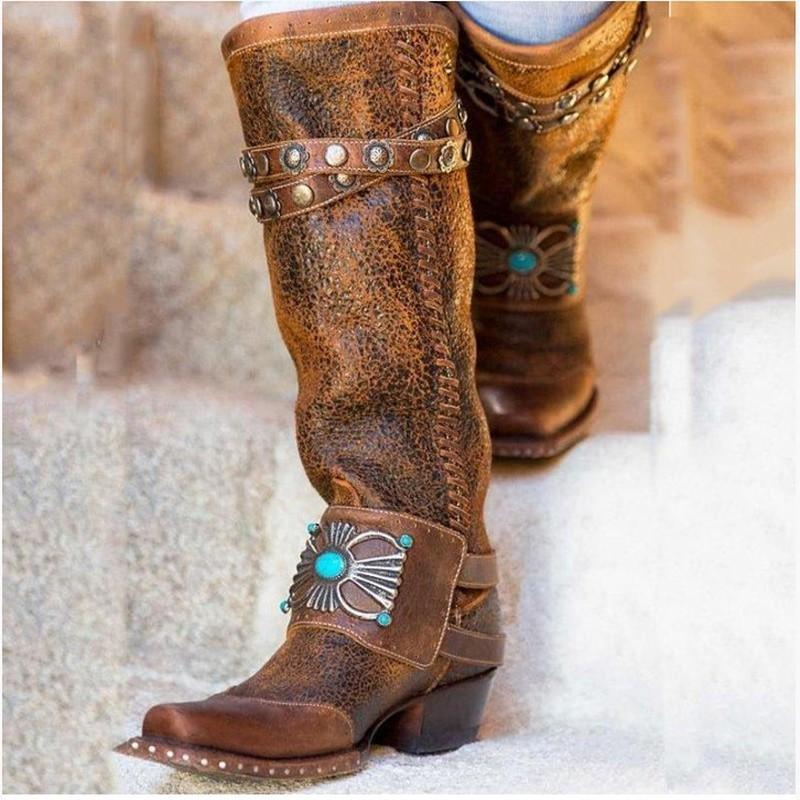 Women Knee High Heels Ethic Shoes Vintage PU Leather High Boots