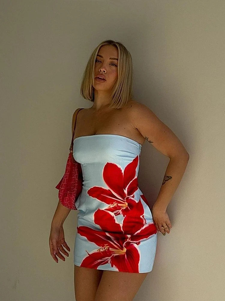 Women Print Off Shoulder Backless Mini Dress Elegant Strapless Sleeveless High Waist Vestidos Chic Female Night Club Party Robes